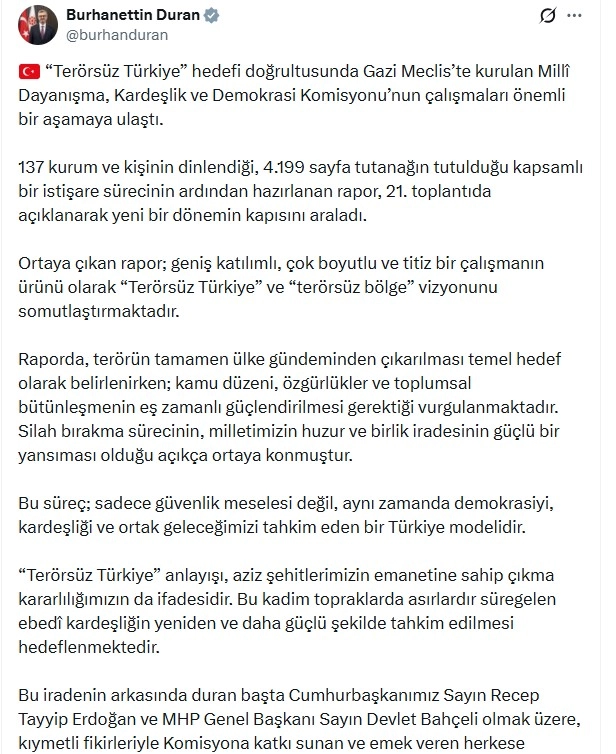 İletişim Başkanı Duran, sanal medya hesabından yaptığı açıklamada, "Terörsüz Türkiye' hedefi doğrultusunda Gazi Meclis’te kurulan Milli Dayanışma, Kardeşlik ve Demokrasi Komisyonu’nun çalışmaları önemli bir aşamaya ulaştı. 137 kurum ve kişinin dinlendiği, 4 bin 199 sayfa tutanağın tutulduğu kapsamlı bir istişare sürecinin ardından hazırlanan rapor, 21’inci toplantıda açıklanarak yeni bir dönemin kapısını araladı. Ortaya çıkan rapor; geniş katılımlı, çok boyutlu ve titiz bir çalışmanın ürünü olarak ‘Terörsüz Türkiye’ ve ‘terörsüz bölge’ vizyonunu somutlaştırmaktadır. Raporda, terörün tamamen ülke gündeminden çıkarılması temel hedef olarak belirlenirken; kamu düzeni, özgürlükler ve toplumsal bütünleşmenin eş zamanlı güçlendirilmesi gerektiği vurgulanmaktadır" dedi.