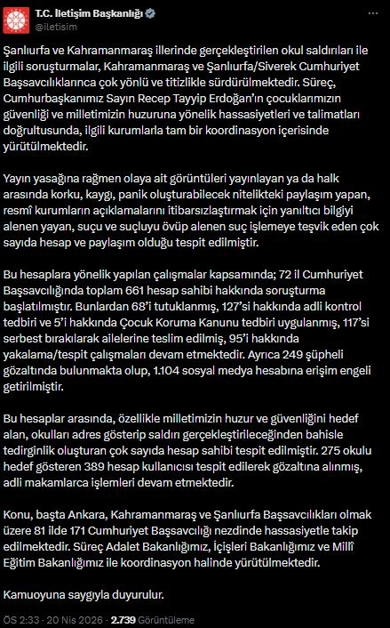 İletişim Başkanlığı'nın sanal medya hesabından yapılan açıklamada, "Şanlıurfa ve Kahramanmaraş illerinde gerçekleştirilen okul saldırıları ile ilgili soruşturmalar, Kahramanmaraş ve Şanlıurfa/Siverek Cumhuriyet Başsavcılıklarınca çok yönlü ve titizlikle sürdürülmektedir. Süreç, Cumhurbaşkanımız Sayın Recep Tayyip Erdoğan’ın çocuklarımızın güvenliği ve milletimizin huzuruna yönelik hassasiyetleri ve talimatları doğrultusunda, ilgili kurumlarla tam bir koordinasyon içerisinde yürütülmektedir. Yayın yasağına rağmen olaya ait görüntüleri yayınlayan ya da halk arasında korku, kaygı, panik oluşturabilecek nitelikteki paylaşım yapan, resmi kurumların açıklamalarını itibarsızlaştırmak için yanıltıcı bilgiyi alenen yayan, suçu ve suçluyu övüp alenen suç işlemeye teşvik eden çok sayıda hesap ve paylaşım olduğu tespit edilmiştir. Bu hesaplara yönelik yapılan çalışmalar kapsamında; 72 il Cumhuriyet başsavcılığında toplam 661 hesap sahibi hakkında soruşturma başlatılmıştır. Bunlardan 68’i tutuklanmış, 127’si hakkında adli kontrol tedbiri ve 5’i hakkında Çocuk Koruma Kanunu tedbiri uygulanmış, 117’si serbest bırakılarak ailelerine teslim edilmiş, 95’i hakkında yakalama/tespit çalışmaları devam etmektedir" denildi.