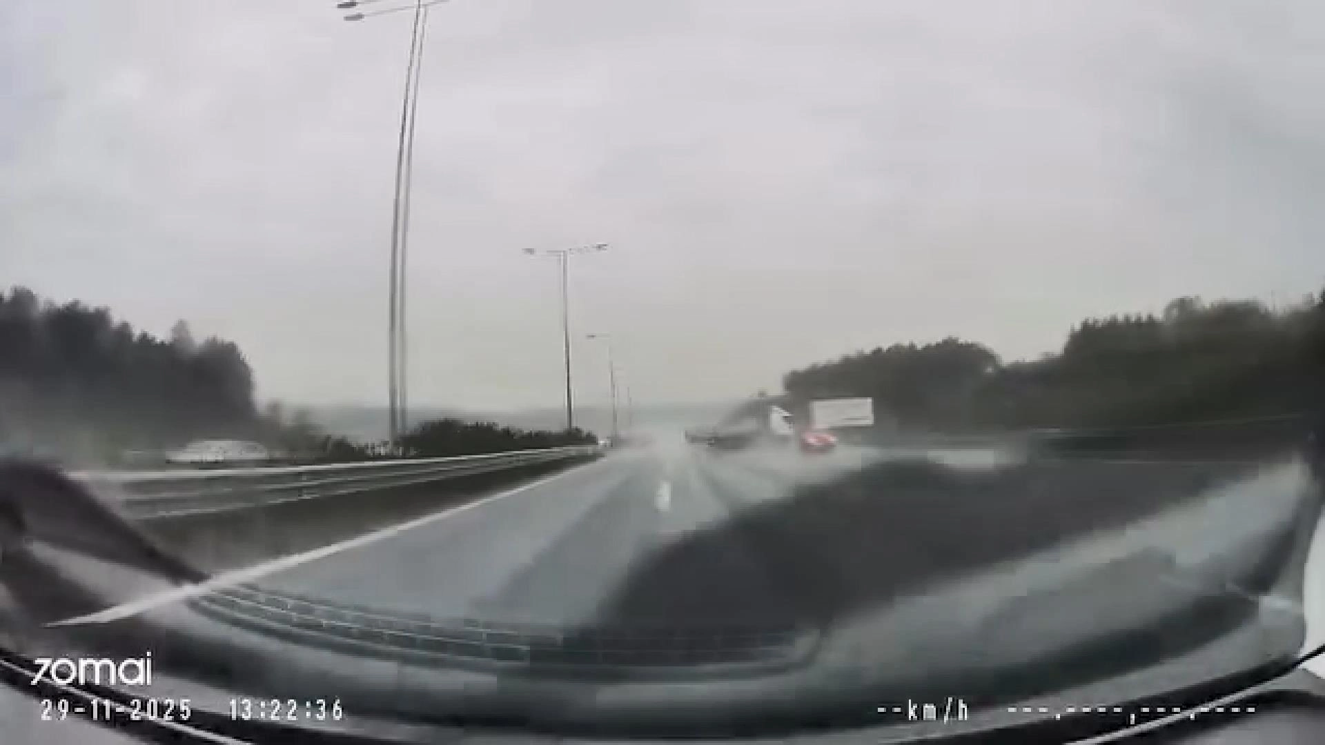 İsa ALMAÇAYIR-Hiba HAKBİLİR/İSTANBUL,(DHA)-BEYKOZ Kuzey Marmara Otoyolu'nda seyir halinde olan TIR şoförü, iddiaya göre yağışlı hava nedeniyle kayganlaşan yolda direksiyon hakimiyetini kaybetti. TIR otoyolda ters dönerek şarampola yuvarlandı. TIR'ın otoyolda ters döndüğü ve sağ şeritte ilerleyen otomobille karşı karşıya geldiği anlar araç kamerasına yansıdı.