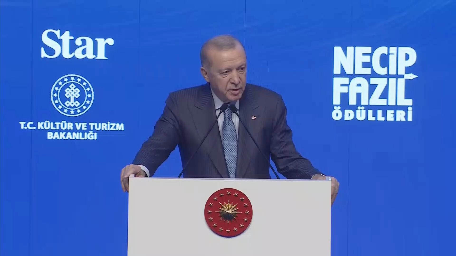 Cumhurbaşkanı Erdoğan, “İçinde bulunduğumuz çağın tükenmeye yüz tutan fikir ve sanat madenine eserleriyle yeni damarlar açan siz kardeşlerime teşekkür ediyorum. Son derece titiz bir değerlendirme süreci ile ödül sahiplerimizi belirleyen jüri üyelerimize şükranlarımı iletiyorum. Üstadın fikir ve sanat mirasına dört elle sarılıp bu senede ödül törenimizi başarıyla tertipleyen Star Gazetesi'ni ve Kültür Bakanlığımızı kutluyorum. Necip Fazıl demek her şeyden önce vakar ve cesaret demektir. Zira gençliğin fikir hamurunu çilesiyle yoğuran üstada göre, hakim bir dava mahkum bir eda ile anlatılamaz. Onun tasavvurunda zafere vasıl olmak, müjdeye nail olmak ancak eza ve cefaya katlanmakla, zorluk ve baskılara göğüs germekle, ama daima dik durmakla mümkündür. Üstad bu prensibini 'Allah, ızdırabını çektirmediği şeyin nimetini vermez' sözüyle açık ve net bir şekilde dile getirmiştir. O, Müslüman'ı yüzünün her hattında tevhid kaleminden bir satır okunan kimse olarak görmüştür. Az önce ifade edildi ya, yüzünün o kırışıklıkları. İşte o çok önemli. Onu yakından tanıyan zaten üstadın yüzündeki o kırışıklıklarda adeta toprağı görür. Ve bizler de üstadın yüzündeki o kırışıklıklardan, hep topraktan geldik toprağa gideceğiz dedik ya, işte bunu görüyoruz. Allah rahmet eylesinö dedi.