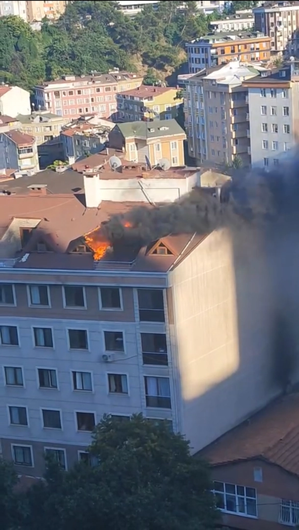 Doğan Can CESUR / İSTANBUL (DHA) -KAĞITHANE'de itfaiye ekipleriyle birlikte çatıya çıkarak yangının söndürülmesine yardım eden polis memuru cep telefonu kamerasıyla kaydedildi. 5 katlı binanın çatısında çıkan yangın kısa sürede söndürüldü. Olay, 28 Haziran Cuma günü saat 18.30 sıralarında Çağlayan Mahallesi'nde meydana geldi. Edinilen bilgiye göre; sokaktaki 5 katlı binanın çatısında henüz bilinmeyen nedenle yangın çıktı. Alevlerin yükseldiğini görenler itfaiye ekiplerine ihbarda bulundu. Kısa sürede olay yerine gelen ekipler, yangına ulaşmak için merdiven aracını kullandı. CANINI TEHLİKEYE ATIP YARDIM ETTİİtfaiye ekipleriyle birlikte çatıya çıkan polis memuru, hortumun halat yardımıyla yukarı çekilmesine yardım etti. Yangın kısa sürede söndürülürken polisin çatıda itfaiye ekiplerine yardım ettiği anlar cep telefonu kamerasıyla kaydedildi. Polis olayla ilgili inceleme başlattı. (DHA)