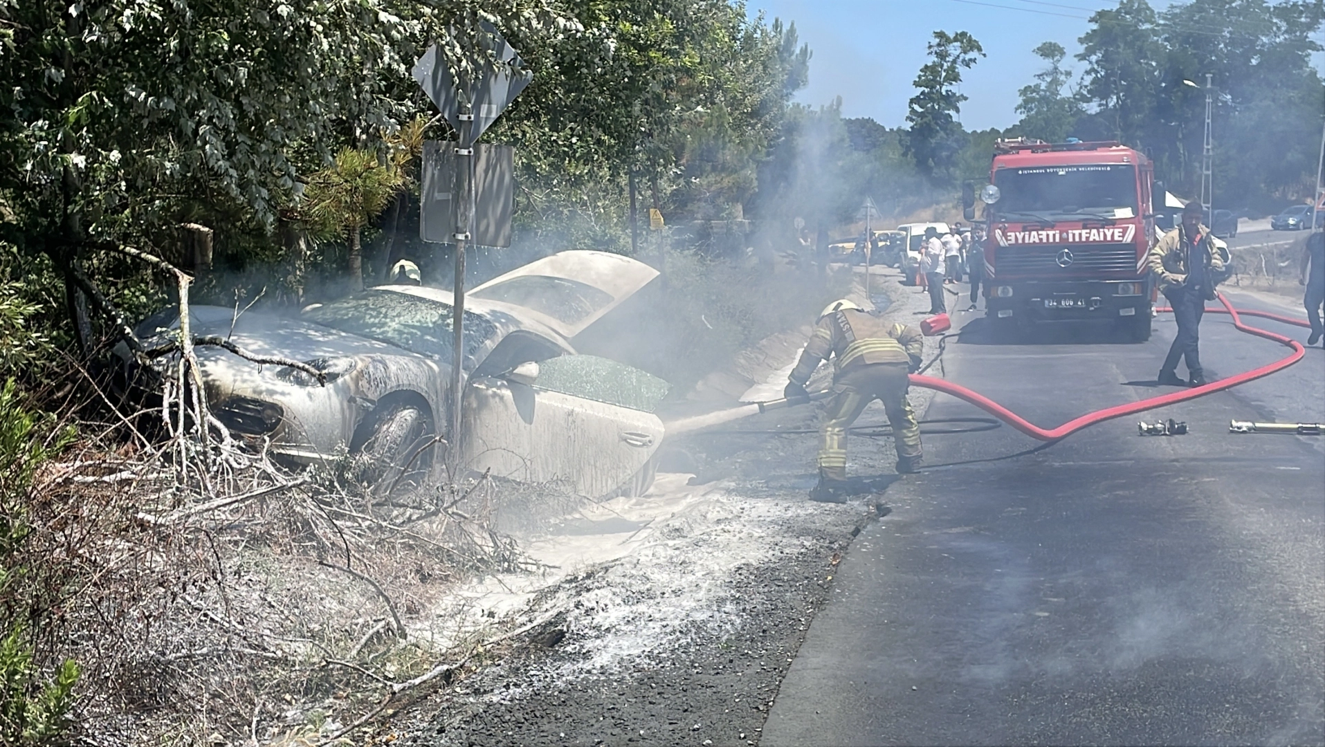 Mehmet Kaan KURT/İSTANBUL,(DHA) - SARIYER’de sürücüsünün kontrolünden çıkan lüks otomobil, yol kenarındaki yeşil alana savruldu. Kaza sonrası alev alev yanan otomobil, itfaiye ekipleri tarafından söndürüldü.Olay saat 13.00 sıralarında Uskumruköy Mahallesi Uskumruköy Caddesi üzerinde meydana geldi. Cadde üzerinde seyir halinde olan 06 AV 3760 plakalı lüks otomobil, sürücüsü Uğur D.'nin direksiyon hakimiyetini kaybetmesi üzerine yol kenarındaki ağaçların arasına savruldu. Sürücü araçtan kendi imkanlarıyla çıkarken, otomobilde yangın çıktı. Ağaçlara da sıçrayan yangın, sürücünün ihbarı üzerine bölgeye gelen itfaiye ekipleri tarafından söndürüldü. Yangın sonrasında otomobil kullanılamaz hale geldi. Olayla ilgili soruşturma başlatıldı. (DHA)