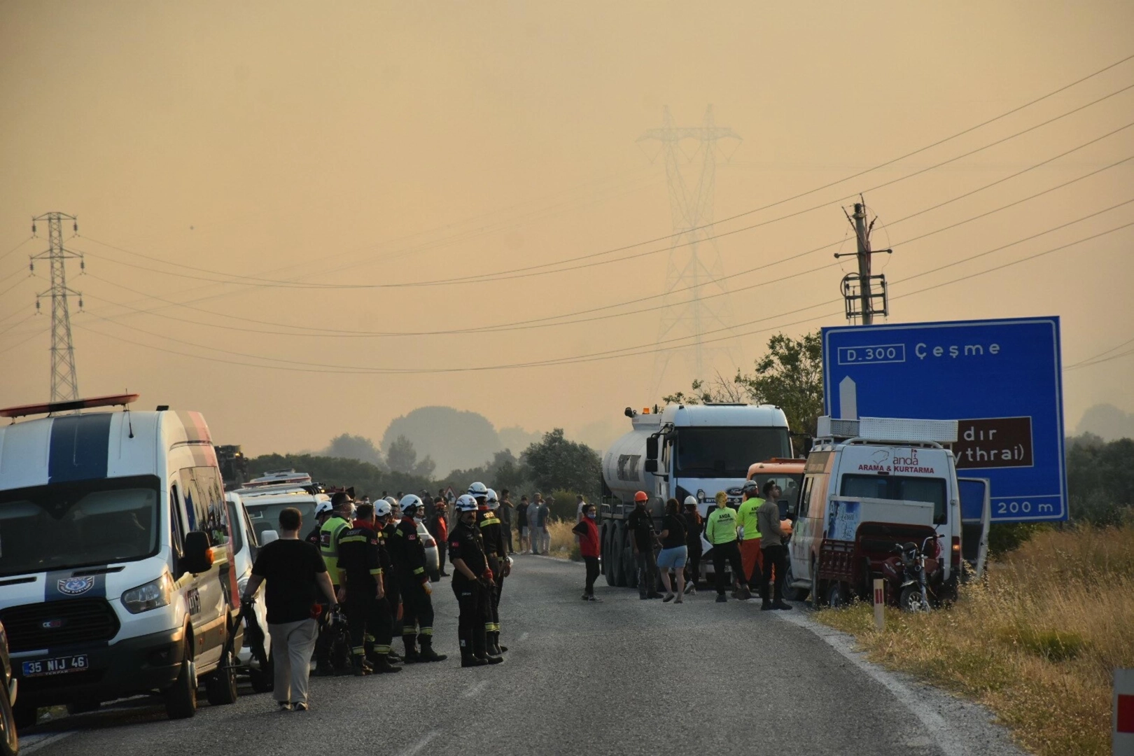 DESTEK EKİPLER SEVK EDİLDİİzmir'in Çeşme ilçesinde tarım arazisinde çıkıp ormana sıçrayan yangın bölgesine destek ekipler sevk edildi. Orman Genel Müdürlüğüne ait 6 uçak, 19 helikopter, 39 arazöz, 14 su ikmal ve 4 dozer ile yangına müdahale ediliyor.3 MAHALLE TAHLİYE EDİLDİ Bölgede rüzgarın etkisiyle alevler, Urla yönüne doğru ilerledi. Yangının tehdit ettiği Ildır Mahallesinin bazı yerleri, Germiyan Mahallesi ve Urla'nın Nohutalan Mahallesi tahliye edildi. (DHA)Kadir ÖZEN/ İZMİR, (DHA)