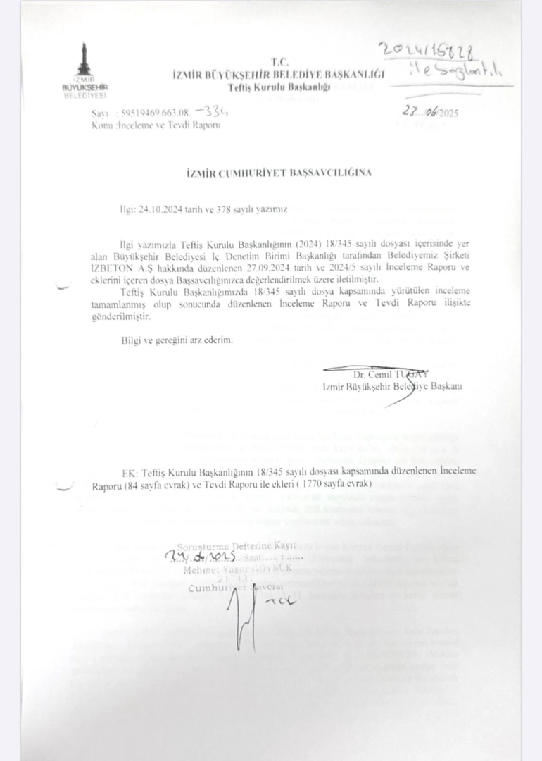 BELEDİYE BİLDİRİMDE BULUNMUŞOperasyonla ilgili İzmir Büyükşehir Belediye Başkanı Cemil Tugay'ın da belediye içerisindeki denetim birimine kendinden önceki dönemle ilgili incelemeler yaptırdığı ortaya çıktı. Bir önceki belediye başkanı Tunç Soyer döneminde yapılan iki dosya yönünden İç Denetim biriminde yapılan araştırmalar sonucu bunlarla ilgili raporlar düzenlendikten sonra Cemil Tugay'ın imzasıyla geçen 24 Haziran tarihli belgeyle savcılığa bildirimde bulunulduğu öğrenildi. İlgili yazıda, "İlgi yazımızla Teftiş Kurulu Başkanlığının (2024) 18/345 sayılı dosyası içerisinde yer alan Büyükşehir Belediyesi İç Denetim Birimi Başkanlığı tarafından Belediyemiz Şirketi IZBETON A.Ş. hakkında düzenlenen 23.06.2024 tarih ve 2024/5 sayılı inceleme Raporu ve eklerini içeren dosya Başsavcılığınızca değerlendirilmek üzere iletilmiştir. Teftiş Kurulu Başkanlığımızda 18345 sayılı dosya kapsamında yürütülen inceleme tamamlanmış olup sonucunda düzenlenen İnceleme Raporu ve Tevdi Raporu ilişikte gönderilmiştir" denildi.Öte yandan operasyonda gözaltı sayısının 126'ya yükseldiği öğrenildi.Tolga TAHÇI/İZMİR, (DHA)