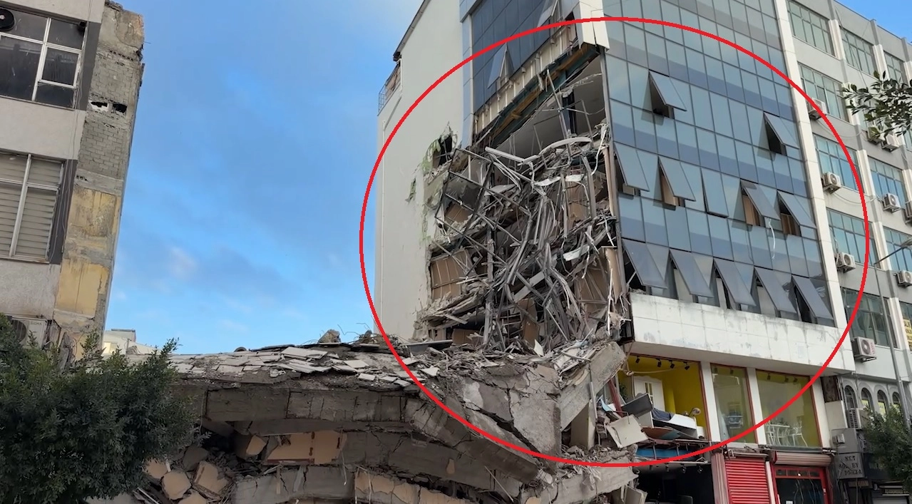 İskenderun'da yıkım çalışması sırasında ağır hasarlı binanın çökmesi sonucu, bitişikteki alışveriş merkezi de hasar aldı. Duvarları ve vitrinleri yıkılan bina ile içindeki eşyalarda zarar meydana geldi. Çevrede güvenlik önlemi alan ekipler, alışveriş merkezini de tedbir amaçlı kapattı. (DHA)