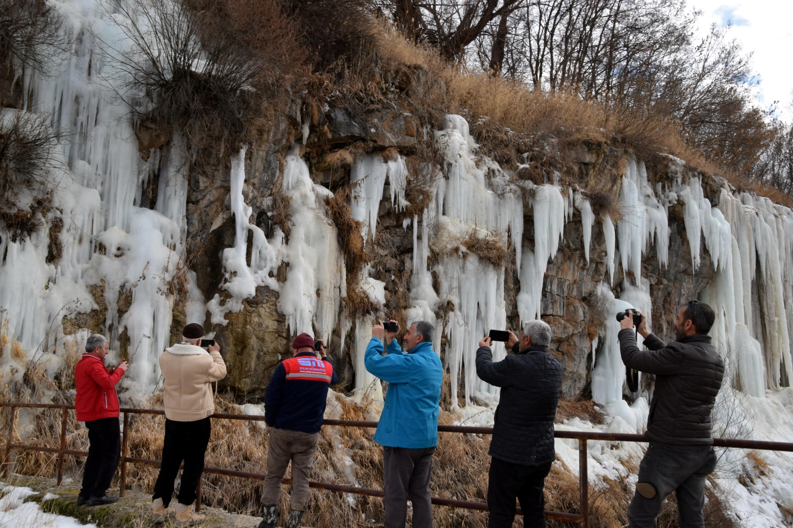 Barış KUL/ERCİŞ (Van), (DHA)- VAN’ın Erciş ilçesindeki Koçköprü Kanyonu’nda oluşan buz sarkıtları fotoğrafçıların ilgi odağı oldu.Erciş'e 12 kilometre uzaklıktaki Koçköprü Kanyonu’nda, geçen günlerde eksi 20 dereceye düşen dondurucu soğuklarda 15 metreyi bulan buz sarkıtları oluştu. Bu haliyle ziyaretçilerine görsel şölen sunan kanyon, fotoğrafçıların da ilgi odağı oldu. Her mevsim farklı güzelliğe bürünen kanyona gelen ziyaretçiler, bölgedeki buz sarkıtlarını fotoğraflıyor.İlçede 20 yıldır doğa fotoğrafçılığı yapan Yaşar Zorlu, "Havaların soğumasıyla Koçköprü Barajı’nda bulunan kanyonda buz sarkıkları oluşmuş. Ben de arkadaşlarımla beraber buradaki muhteşem manzaranın fotoğraflarını çekip, sosyal medya hesaplarımdan paylaşıyorum. Bu şekilde bölgenin tanıtımına da katkıda bulunuyorum. Herkesin gelip bu manzarayı görmesini isterim" dedi. (DHA)