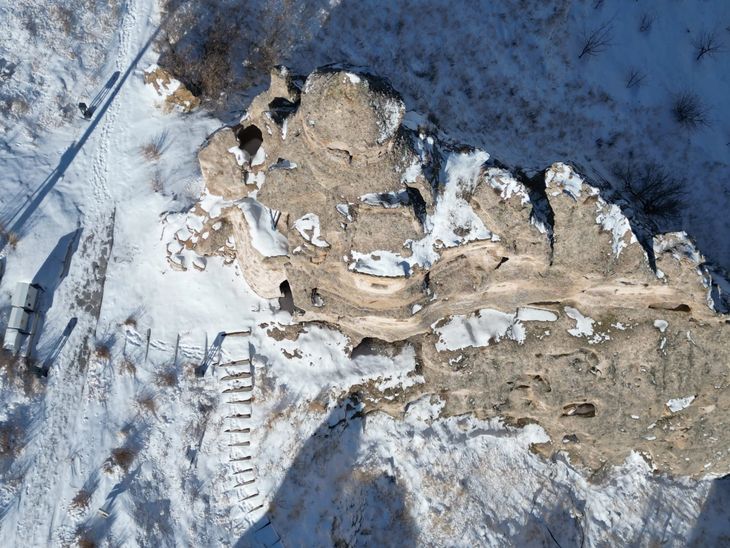 Metin DEĞİRMENCİ/YEŞİLHİSAR (Kayseri), (DHA)- KAPADOKYA'nın giriş kapısı olarak bilinen Kayseri’nin Yeşilhisar ilçesine bağlı Soğanlı Ören Yeri’ndeki vadi, kar yağışı ile birlikte beyaz örtüyle kaplandı. Ortaya çıkan seyirlik manzara dronla görüntülendi.