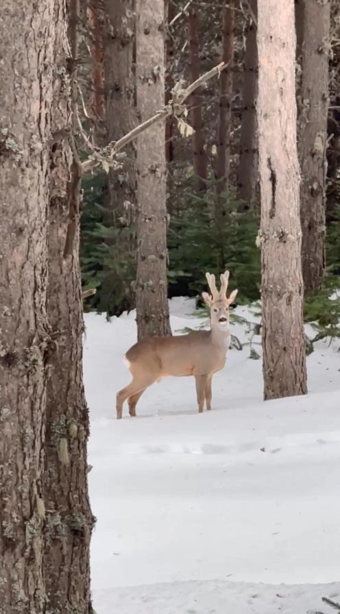 Gerede ilçesinin yüksek kesimlerindeki karla kaplı ormanda karaca görüntülendi. Ormanda gezen karacayı fark eden kişi, o anları cep telefonu ile kaydetti. Bir süre kendisini görüntüleyen kişiye bakan karaca daha sonra ormanın iç kısımlarına girerek gözden kayboldu. (DHA)
