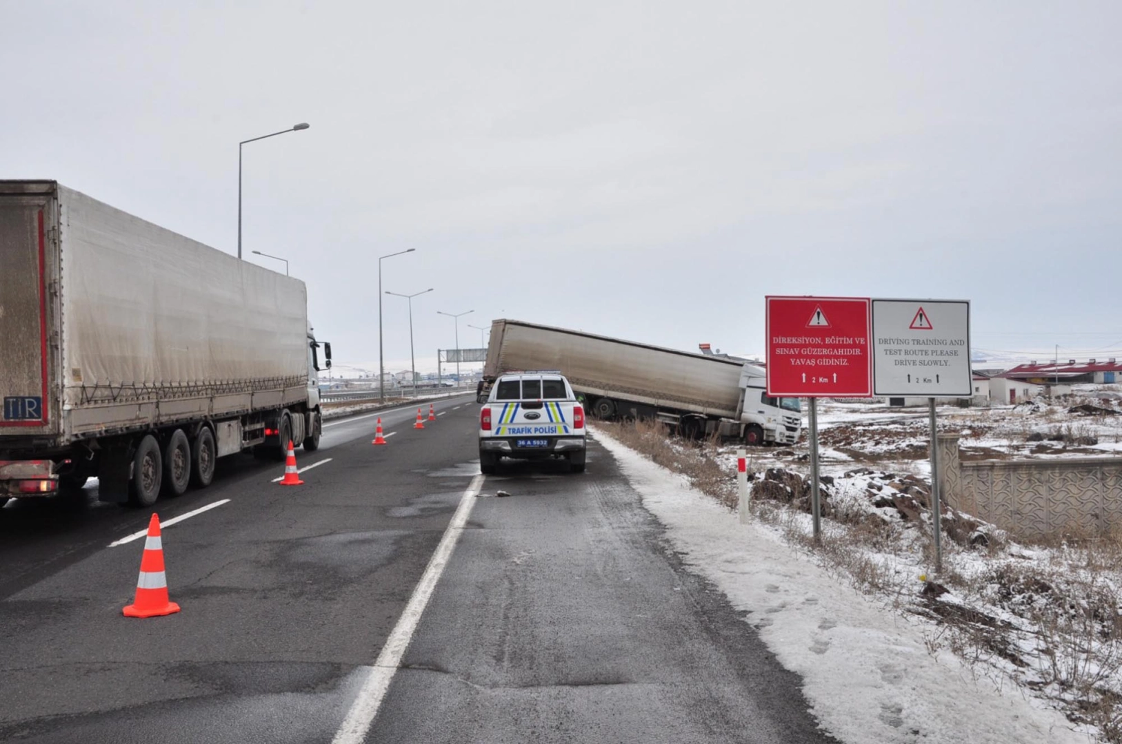 Kaza, Kars-Ardahan kara yolu Ani Ören Yeri Kavşağı mevkisinde meydana geldi. N.K.'nin yolda oluşan gizli buzlanma nedeniyle kontrolünü yitirdiği 73 AAE 621 plakalı TIR, kayarak yoldan çıktı. İhbarla kaza yerine bölge trafik ekipleri sevk edildi. TIR'da hasar oluşurken, kara yolunda trafik akışı bir süre kontrollü olarak tek şeritten sağlandı. TIR'ın kaldırılması sonrası trafik normale dönerken, kaza ile ilgili inceleme başlatıldı. (DHA)