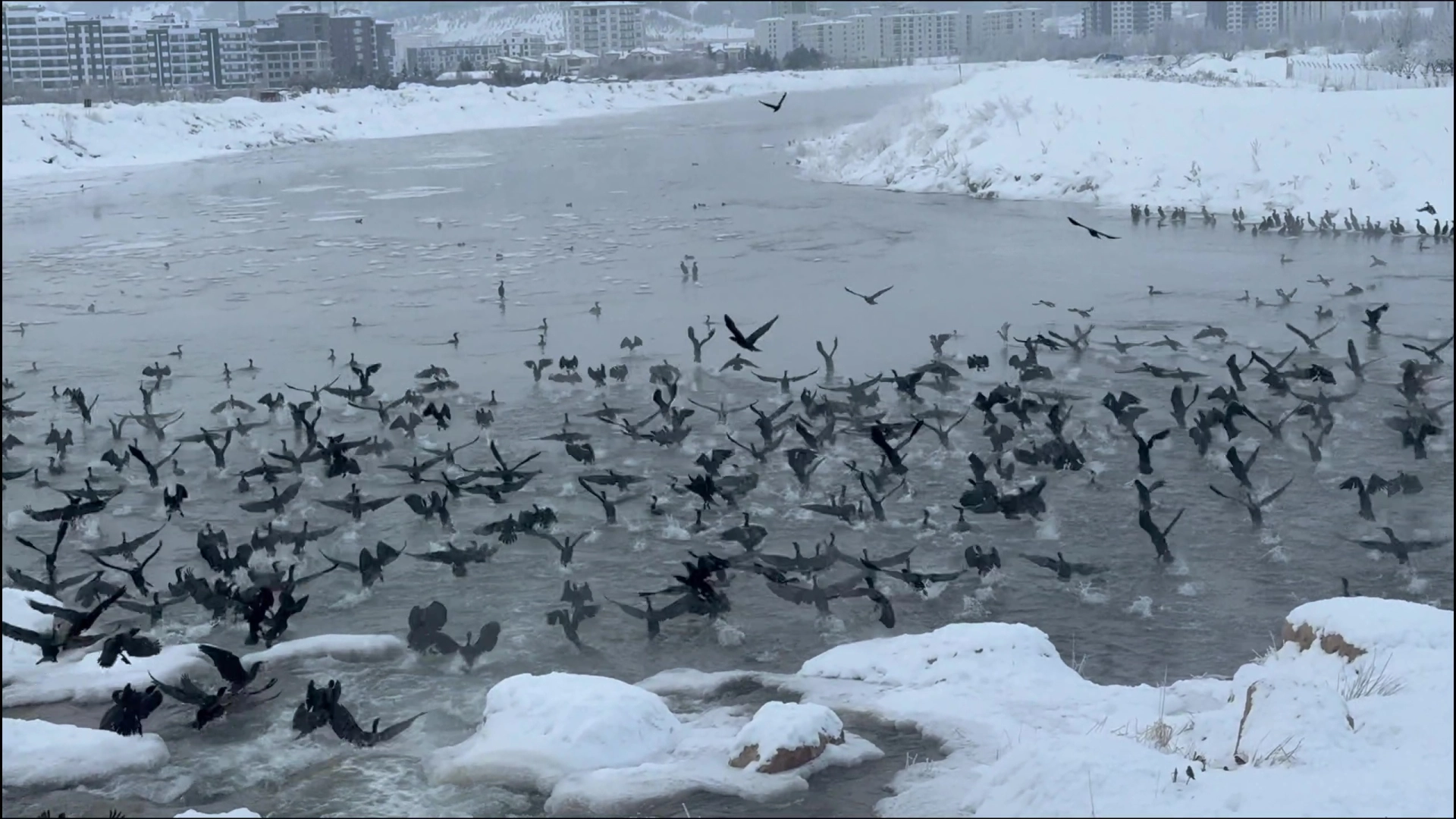 Eraydın AYTEKİN/SİVAS, (DHA)- KAR yağışı ve soğuk havanın hükmünü sürdürdüğü Sivas'ta karabataklar, son günlerde Kızılırmak Nehri'ni mesken tuttu. Binlerce karabatağın hem suda ve hem de gökyüzündeki görüntüleri ilgi çekti.