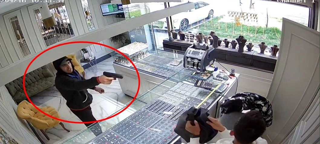 Yiğithan HÜYÜK/BURSA, (DHA)- BURSA'da, silahlı soygun girişimini şaka sanan kuyumcu, elinde tabancayla dükkana girip önüne çanta atan şüpheliye, ‘Şaka yapma’ diye bağırdı. Şüphelinin 1 el ateş ettikten sonra kaçtığı anlar, iş yerinin güvenlik kamerasına yansıdı.Olay, saat 11.00 sıralarında, Osmangazi ilçesi Panayır Mahallesi'ndeki kuyumcuda meydana geldi. Fatih A.'ya ait dükkana gelen şapkalı bir kişi, selam verip içeri girdikten sonra elindeki tabancayı iş yeri sahibine doğrulttu. Fatih A.’nın önüne altınları doldurması için çanta atan şüpheli, ‘Boşalt kasayı’ dedi. Fatih A., şüpheliye ‘Şaka yapma’ diye bağırdı. İş yeri sahibinin bağırması üzerine tedirginlik yaşayan şüpheli, 1 el ateş ettikten sonra koşarak kaçtı. Kurşun, tezgahın üzerindeki para sayma makinesine isabet ederken, o anlar da iş yerinin güvenlik kamerasına yansıdı. İş yeri sahibinin panik butonuna basmasıyla, adrese polis ekipleri sevk edildi. Şüphelinin yakalanması için çalışma başlatıldı. (DHA)