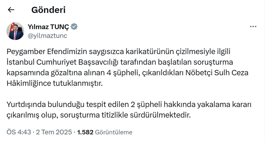 BAKAN TUNÇ: 4 ŞÜPHELİ TUTUKLANDI, 2 ŞÜPHELİ HAKKINDA YAKALAMA KARARI ÇIKARILDIAdalet Bakanı Yılmaz Tunç, soruşturmayla ilgili sosyal medya hesabından açıklama yaptı. Bakan Tunç, "Peygamber Efendimizin saygısızca karikatürünün çizilmesiyle ilgili İstanbul Cumhuriyet Başsavcılığı tarafından başlatılan soruşturma kapsamında gözaltına alınan 4 şüpheli, çıkarıldıkları Nöbetçi Sulh Ceza Hakimliğince tutuklanmıştır. Yurt dışında bulunduğu tespit edilen 2 şüpheli hakkında yakalama kararı çıkarılmış olup, soruşturma titizlikle sürdürülmektedir" dedi. (DHA)Eda KOÇ/ANKARA, (DHA)