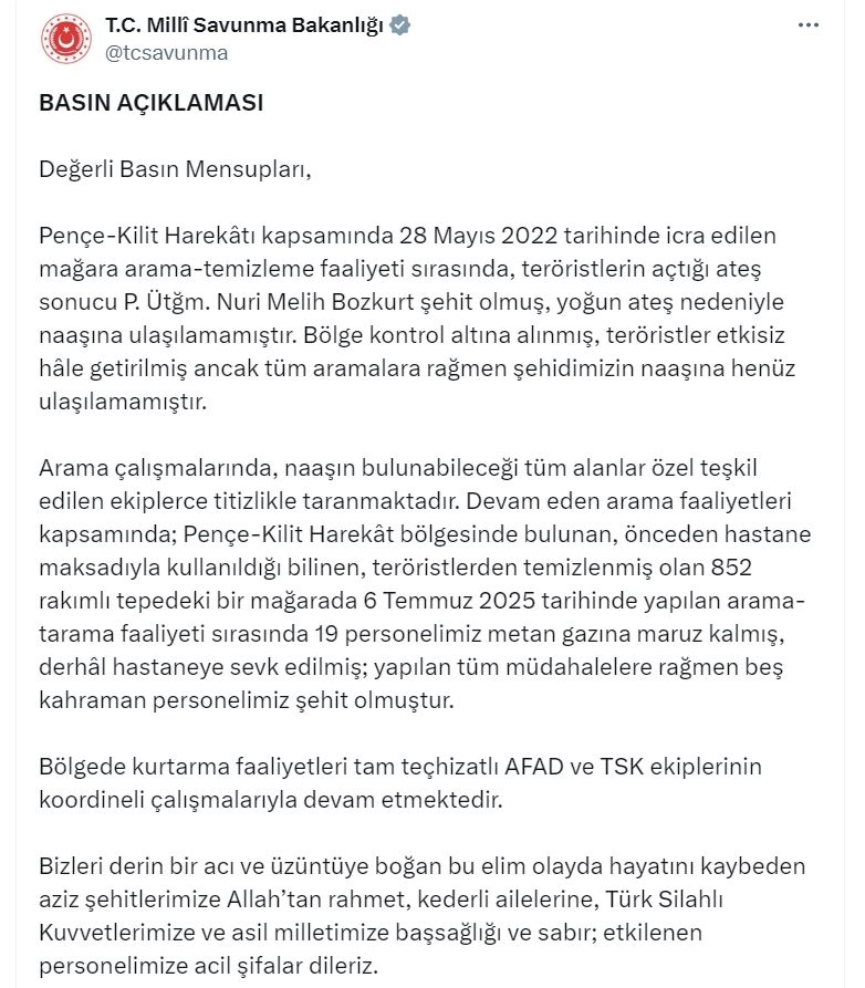 ANKARA, (DHA)- MİLLİ Savunma Bakanlığı (MSB), Pençe-Kilit Harekat bölgesindeki bir mağarada yapılan arama- tarama faaliyeti sırasında metan gazına maruz kalan 19 askerden 5’inin şehit olduğunu duyurdu.Bakanlığın sosyal medya hesabından yapılan açıklamada, "Pençe-Kilit Harekatı kapsamında 28 Mayıs 2022 tarihinde icra edilen mağara arama-temizleme faaliyeti sırasında, teröristlerin açtığı ateş sonucu Piyade Üsteğmen Nuri Melih Bozkurt şehit olmuş, yoğun ateş nedeniyle naaşına ulaşılamamıştır. Bölge kontrol altına alınmış, teröristler etkisiz hale getirilmiş ancak tüm aramalara rağmen şehidimizin naaşına henüz ulaşılamamıştır. Arama çalışmalarında, naaşın bulunabileceği tüm alanlar özel teşkil edilen ekiplerce titizlikle taranmaktadır. Devam eden arama faaliyetleri kapsamında; Pençe-Kilit Harekat bölgesinde bulunan, önceden hastane maksadıyla kullanıldığı bilinen, teröristlerden temizlenmiş olan 852 rakımlı tepedeki bir mağarada 6 Temmuz 2025 tarihinde yapılan arama-tarama faaliyeti sırasında 19 personelimiz metan gazına maruz kalmış, derhal hastaneye sevk edilmiş; yapılan tüm müdahalelere rağmen 5 kahraman personelimiz şehit olmuştur. Bölgede kurtarma faaliyetleri tam teçhizatlı AFAD ve TSK ekiplerinin koordineli çalışmalarıyla devam etmektedir. Bizleri derin bir acı ve üzüntüye boğan bu elim olayda hayatını kaybeden aziz şehitlerimize Allah'tan rahmet, kederli ailelerine, Türk Silahlı Kuvvetlerimize ve asil milletimize başsağlığı ve sabır; etkilenen personelimize acil şifalar dileriz" denildi. (DHA)