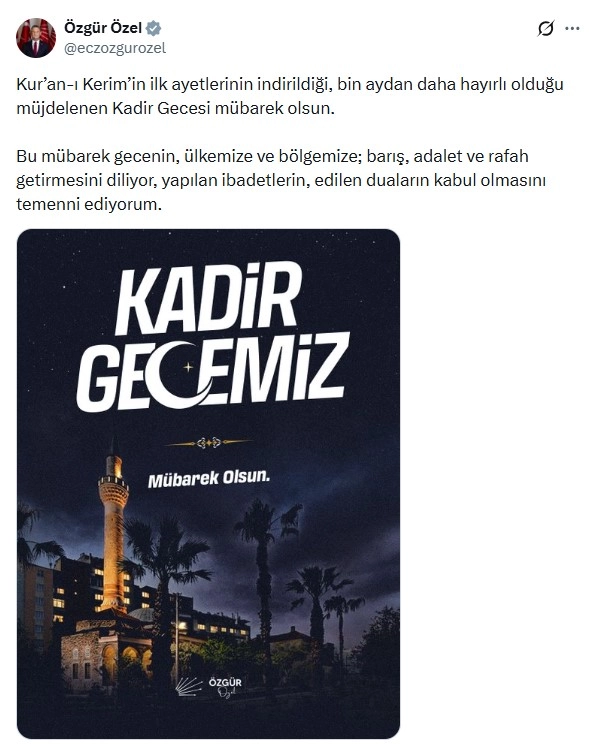 ANKARA, (DHA)- CHP Genel Başkanı Özgür Özel, "Kur’an-ı Kerim’in ilk ayetlerinin indirildiği, bin aydan daha hayırlı olduğu müjdelenen Kadir Gecesi mübarek olsun" dedi.