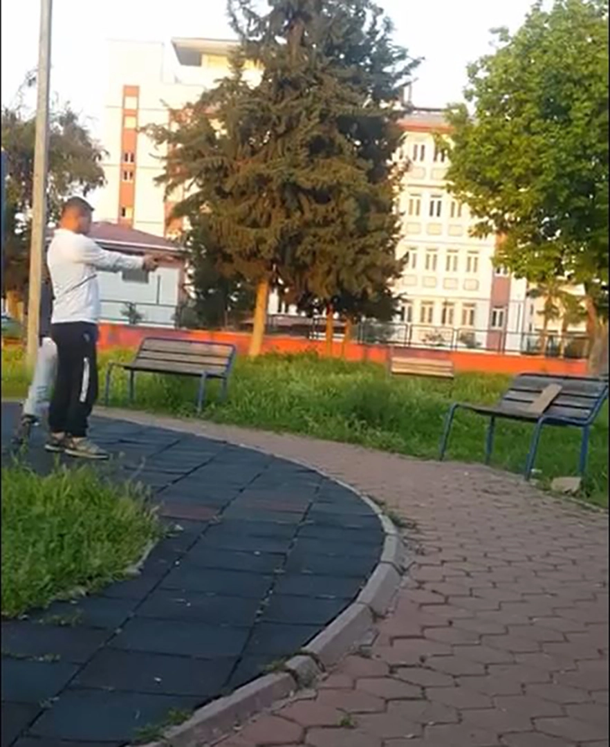 Yusuf YILDIZ/ADANA, (DHA)-ADANA'da geldikleri parkta oyuncak silahla atış talimi yapan çocuk ile onu yönlendiren kişi, cep telefonu kamerasına yansıdı.