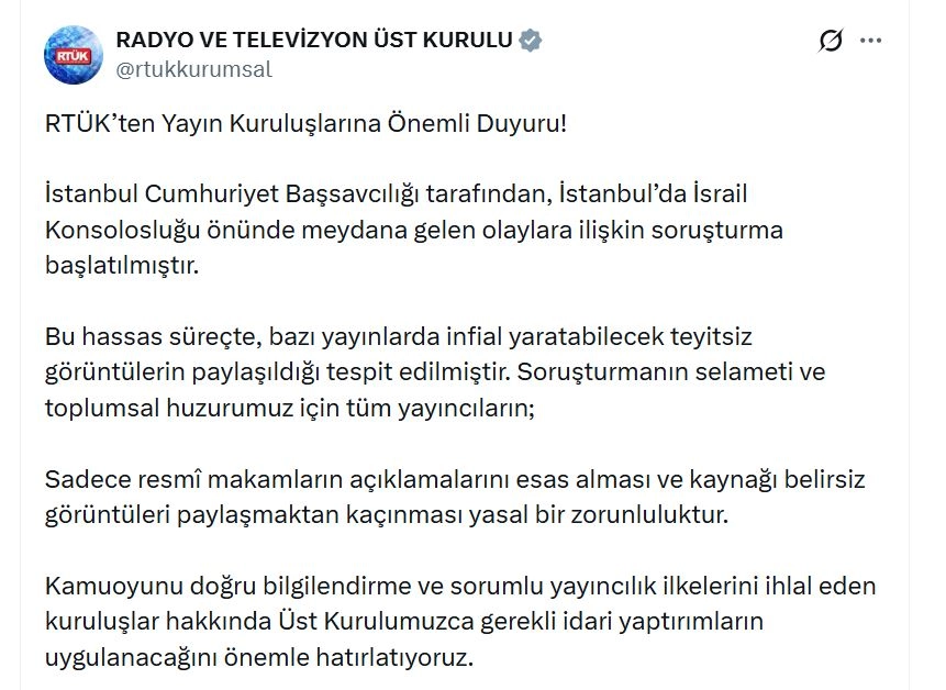 RTÜK'ün sanal medya hesabından yapılan açıklamada, "İstanbul Cumhuriyet Başsavcılığı tarafından, İstanbul'da İsrail Konsolosluğu önünde meydana gelen olaylara ilişkin soruşturma başlatılmıştır. Bu hassas süreçte, bazı yayınlarda infial yaratabilecek teyitsiz görüntülerin paylaşıldığı tespit edilmiştir. Soruşturmanın selameti ve toplumsal huzurumuz için tüm yayıncıların; sadece resmi makamların açıklamalarını esas alması ve kaynağı belirsiz görüntüleri paylaşmaktan kaçınması yasal bir zorunluluktur. Kamuoyunu doğru bilgilendirme ve sorumlu yayıncılık ilkelerini ihlal eden kuruluşlar hakkında Üst Kurulumuzca gerekli idari yaptırımların uygulanacağını önemle hatırlatıyoruz" denildi. (DHA)