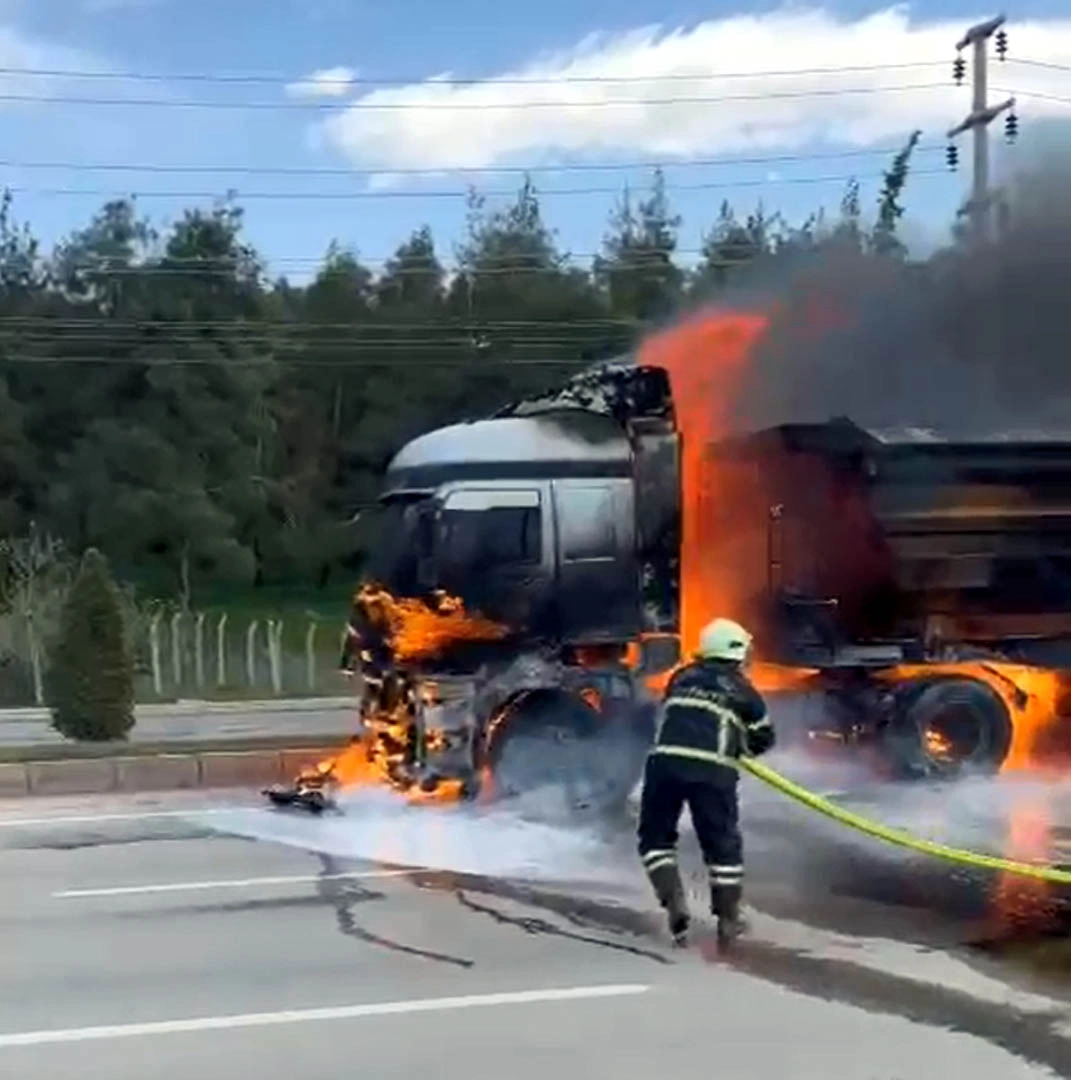 Ömer KOÇ/KAHRAMANMARAŞ, (DHA)- KAHRAMANMARAŞ'ta seyir halindeki kamyonda yangın çıktı. Alevler, ekiplerin müdahalesi ile söndürüldü. Kahramanmaraş-Adana kara yolunda şoförü ve plakası bilinmeyen hafriyat kamyonundan birden duman yükselmeye başladı. Şoför aracı durdururken, alevler de kamyonu tamamen sardı. İhbarla olay yerine itfaiye ekipleri sevk edildi. Ekipler alevlere müdahale ederken, söndürme çalışmaları sırasında kamyonda patlamalar yaşandı. Yangın söndürülürken, kamyon kullanılamaz hale geldi.
