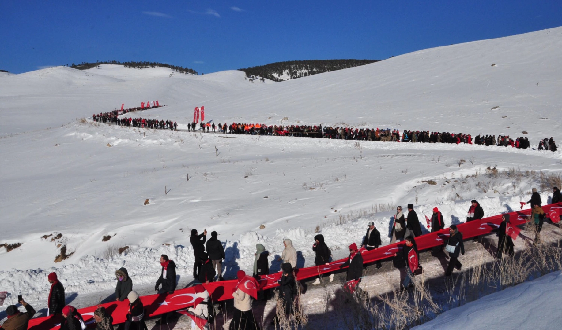 Sarıkamış Harekatı sırasında donarak şehit olan binlerce Mehmetçik’i anma programı kapsamında sabah saatlerinde toplanma merkezinde bir araya gelenler, ellerinde bayraklarla 5,5 kilometrelik yürüyüş için hazırlandı. Termometrelerin eksi 22 dereceyi gösterdiği Sarıkamış'ta 'Türkiye Şehitleriyle Yürüyor' temalı yürüyüşe katılanlara, Türk Kızılay tarafından çorba, çay, kete ikram edildi. Okunan duanın ardından önde Atatürk posteri ve Türk bayrağı ile binlerce kişi yürüyüşe başladı. Yürüyüşe, Aile ve Sosyal Hizmetler Bakanı Mahinur Özdemir Göktaş, Gençlik ve Spor Bakanı Osman Aşkın Bak da katıldı. Kızılçubuk Toplanma Alanında 09.00’da başlayan yürüyüş, Ay Yıldız Tören Alanında sona erdi. Yaklaşık 1,5 saat süren yürüyüş sırasında jandarma ve polis ekipleri güvenlik önlemi aldı. Kars İl Sağlık Müdürlüğü de yürüyüş güzergahında soğuk hava ve don nedeniyle UMKE ve sağlık ekipleri konuşlandırdı.