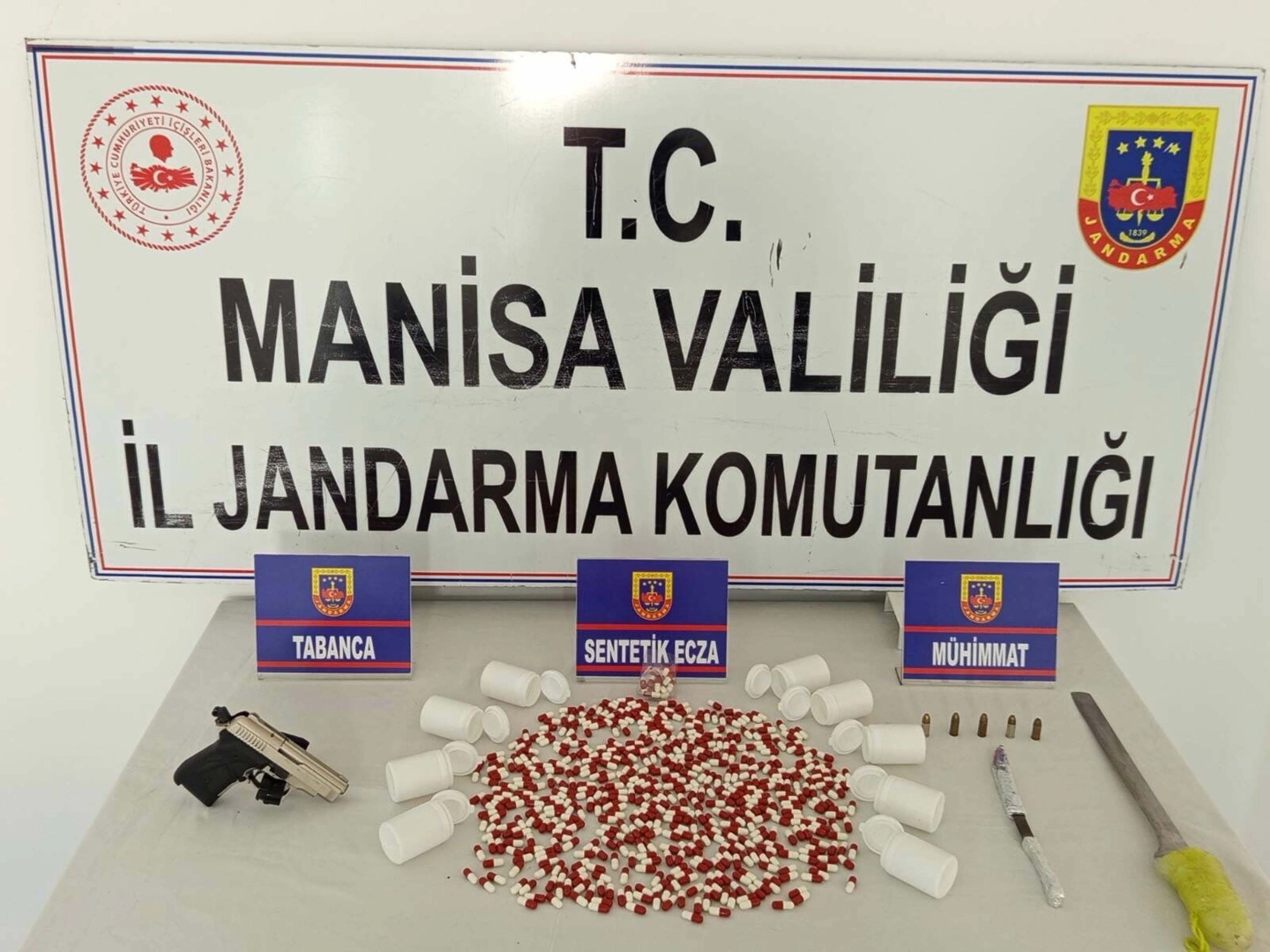 Soma İlçe Jandarma Komutanlığı ekiplerince uyuşturucu veya uyarıcı madde imal ve ticaretine yönelik yürütülen çalışmalar kapsamında, E.Y. (23), F.A. (23) ve F.A. (22) isimli şüphelilerin ikametlerinde önceki gün arama yapıldı. Yapılan aramalarda 516 sentetik ecza hap ile 1 pala, 1 bıçak ve 1 kurusıkı tabanca ele geçirildi. Gözaltına alınarak adliyeye sevk edilen 3 şüpheli, çıkarıldıkları mahkemece tutuklandı. (DHA)