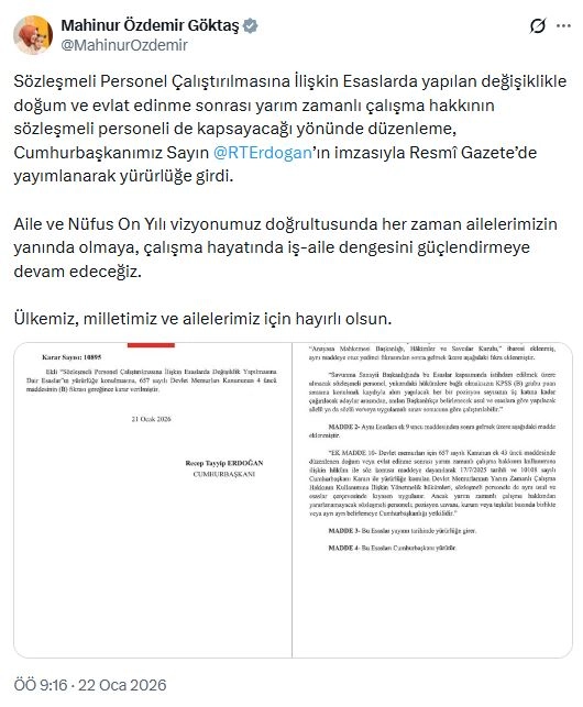 Aile ve Sosyal Hizmetler Bakanı Mahinur Özdemir Göktaş, düzenlemeye ilişkin sanal medya hesabından yaptığı açıklamada, "Sözleşmeli Personel Çalıştırılmasına İlişkin Esaslar'da yapılan değişiklikle doğum ve evlat edinme sonrası yarım zamanlı çalışma hakkının sözleşmeli personeli de kapsayacağı yönünde düzenleme, Cumhurbaşkanımız Sayın Recep Tayyip Erdoğan'ın imzasıyla Resmi Gazete'de yayımlanarak yürürlüğe girdi. 'Aile ve Nüfus 10 Yılı' vizyonumuz doğrultusunda her zaman ailelerimizin yanında olmaya, çalışma hayatında iş-aile dengesini güçlendirmeye devam edeceğiz. Ülkemiz, milletimiz ve ailelerimiz için hayırlı olsun" dedi. (DHA)