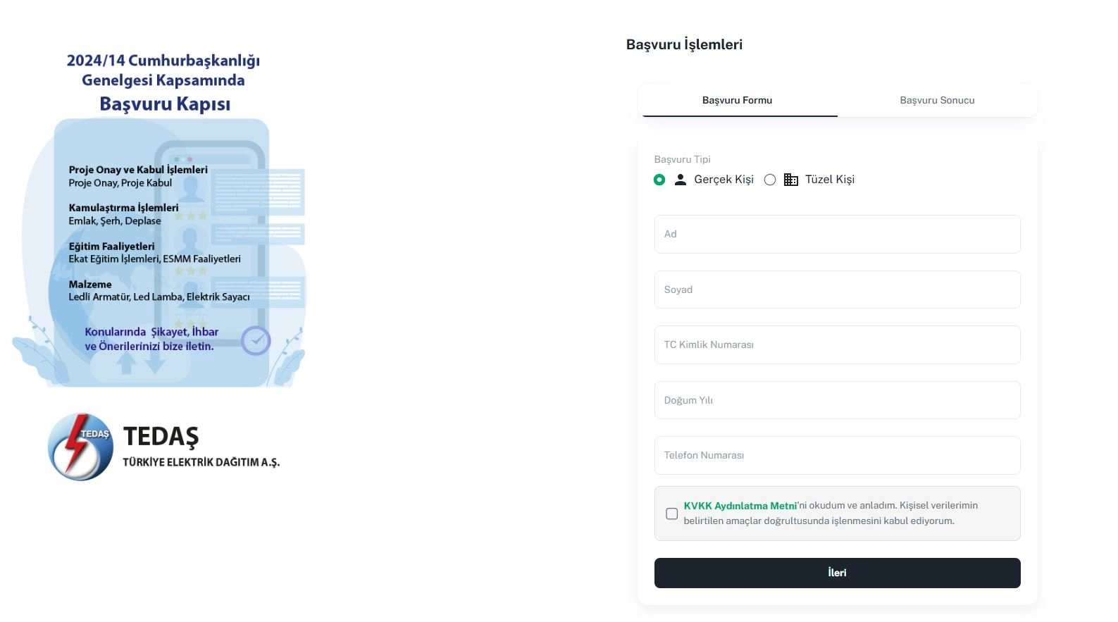 ANKARA, (DHA)- TÜRKİYE Elektrik Dağıtım A.Ş. (TEDAŞ), kamu hizmetlerini güçlendirmek ve kamuya erişimi kolaylaştırmak amacıyla, TEDAŞ Başvuru Kapısı uygulamasının devreye alındığını açıkladı.TEDAŞ'tan yapılan açıklamaya göre, kamu hizmetlerini güçlendirmek ve kamuya erişimi kolaylaştırmak amacıyla, TEDAŞ Başvuru Kapısı uygulaması hayata geçirildi. TEDAŞ'ın öz kaynaklarıyla geliştirilen sistem, vatandaşların TEDAŞ ile iletişimini daha etkin, verimli, saydam ve hesap verilebilir hale getirmeyi hedefliyor. Yapılan başvuru sistematik olarak kayıt altına alınarak sürecinin takibi sağlanabiliyor. Bu sayede vatandaşlar, taleplerinin hangi aşamada olduğunu kolaylıkla görebilecek. Sistem, Rehberlik, Teftiş ve Denetim Faaliyetlerinin Düzenli ve Etkin Bir Şekilde Yerine Getirilmesine İlişkin Cumhurbaşkanlığı Genelgesi kapsamında geliştirildi. (DHA)