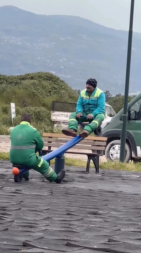 Yiğithan HÜYÜK/BURSA, (DHA)- BURSA’da çocuk oyun parkını temizledikten sonra mola veren temizlik görevlileri, tahterevalliyle dakikalarca eğlenip, adeta çocukluklarına döndü. Mahallelinin çektiği cep telefonu görüntülerinde günün iş stresini çocuk gibi eğlenerek attıkları görülen işçilerden Enes Akbulut (33), “Mola saatinde canımız sıkıldı. Oturduk ve eğlendik. İşimizi severek yapıyoruz” dedi.