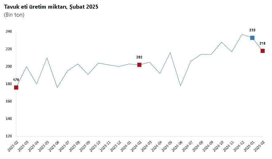 ANKARA, (DHA)- TÜRKİYE İstatistik Kurumu (TÜİK), şubat ayında aylık tavuk eti, tavuk yumurtası ve içme sütü üretim miktarlarının azaldığını açıkladı.TÜİK, Şubat 2025 dönemine ilişkin kümes hayvancılığı ile süt ve süt ürünleri üretimi verilerini açıkladı. Buna göre; bir önceki aya göre tavuk eti üretimi yüzde 6,4 oranında azalarak 218 bin 260 ton, tavuk yumurtası üretimi de yüzde 6,4 oranında azalarak 1 milyar 547 milyon 93 bin adet oldu. Bir önceki yılın aynı ayına göre ise tavuk yumurtası üretimi yüzde 10,8 azaldı, kesilen tavuk sayısı yüzde 5,8 arttı, tavuk eti üretimi yüzde 8,2 arttı. Ocak-şubat döneminde bir önceki yılın aynı dönemine göre, tavuk yumurtası üretimi yüzde 10,4 azaldı, kesilen tavuk sayısı yüzde 8,8 arttı, tavuk eti üretimi yüzde 11,5 arttı.Şubat ayında bir önceki aya göre ticari süt işletmelerince toplanan inek sütü miktarı yüzde 8,9 oranında azalarak 857 bin 821 ton oldu. İçme sütü üretimi ise yüzde 11,9 oranında azalarak 132 bin 720 ton olarak gerçekleşti. Ticari süt işletmeleri tarafından toplanan inek sütü miktarı, bir önceki yılın aynı ayına göre yüzde 5,4 azaldı, ocak-şubat döneminde ise bir önceki yılın aynı dönemine göre yüzde 1,5 azaldı.Ayrıca, şubat ayında bir önceki yılın aynı ayına göre, inek peyniri üretimi önemli bir değişiklik göstermedi, ayran ve kefir üretimi yüzde 6,9 arttı, yoğurt üretimi yüzde 4,6 arttı, içme sütü üretimi yüzde 0,6 azaldı, tereyağı ve sadeyağ üretimi yüzde 1,5 azaldı. Ocak-şubat döneminde ise bir önceki yılın aynı dönemine göre, inek peyniri üretimi yüzde 0,6 azaldı, ayran ve kefir üretimi yüzde 5,9 arttı, yoğurt üretimi yüzde 3,6 arttı, içme sütü üretimi yüzde 1,4 azaldı, tereyağı ve sadeyağ üretimi yüzde 0,4 arttı.
