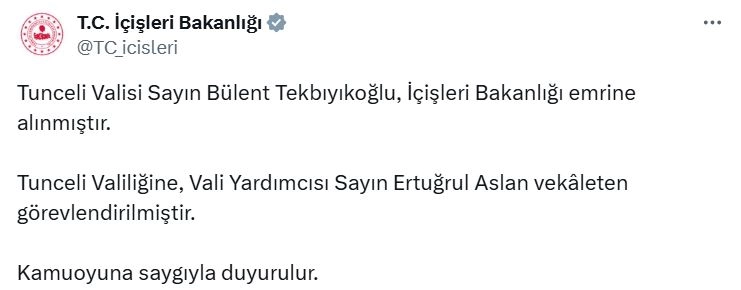 ANKARA, (DHA)- İÇİŞLERİ Bakanlığı, Tunceli Valisi Bülent Tekbıyıkoğlu'nun merkeze alındığını, yerine vekaleten Vali Yardımcısı Ertuğrul Aslan'ın görevlendirildiğini duyurdu.Bakanlıktan yapılan yazılı açıklamada, "Tunceli Valisi Sayın Bülent Tekbıyıkoğlu, İçişleri Bakanlığı emrine alınmıştır. Tunceli Valiliğine, Vali Yardımcısı Sayın Ertuğrul Aslan vekaleten görevlendirilmiştir" denildi. (DHA)