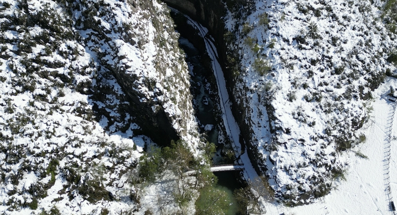 Ayhan ACAR/ULUS(Bartın),(DHA)-BARTIN'ın Ulus ilçesinde 'aşk acısını dindiren şelale' olarak ünlenen Ulukaya Kanyonu ve Şelalesi, nisan ayında karla kaplandı. Bölgedeki eşsiz manzara havadan dron ile görüntülendi.Ulus ilçesine bağlı Ulukaya köyündeki Ulukaya Kanyonu ve Şelalesi, mitolojik hikayeye göre; aşk tanrısı Eros'un intihar eden eşi Selamnos'un bedenini dönüştürdüğü yer olarak biliniyor. Hikayeye göre; şelaleden su içen, mendilini ıslatan ya da yüzünü yıkayanlar, yaşadıkları aşk acısından kurtuluyor. 2019 yılında Kültür ve Turizm Bakanlığı tarafından 'doğal sit alanı' ilan edildikten sonra şelale ve kanyonu bugüne kadar yaklaşık 500 bine yakın yerli ve yabancı turist ziyaret etti. TURİSTLERDEN YOĞUN İLGİBölge, 2020 yılında Cumhurbaşkanı Recep Tayyip Erdoğan'ın imzasıyla 'kesin korunacak hassas alan' olarak ilan edildi. Ulus ilçe merkezine 17 kilometre uzaklıkta, 10 metre genişliğinde bir kaya oyuğundan çıkan ve 25 metre yükseklikten akan şelale ve 4 kilometre uzunluğundaki kanyon her mevsim yerli ve yabancı turistlerin ilgisini çekiyor. Nisan ayında 4 gün boyunca kar yağışı alan bölgedeki eşsiz manzara havadan dron ile görüntülendi. (DHA)