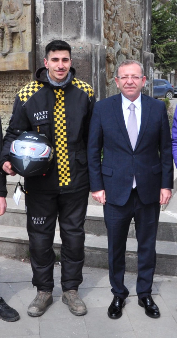 Volkan KARABAĞ/KARS, (DHA)- KARS Valisi Ziya Polat, kuryelik yaparken kurallara uyarak hiç ceza almayan 3 motosiklet sürücüsüne kask hediye etti. Kars'ta 3-9 Mayıs Trafik Haftası etkinlikleri kapsamında Cumhuriyet Meydanı’nda Emniyet Müdürlüğü Trafik Şube ekipleri, motosiklet sürücülerine kurallara ilişkin bilgilendirme yaptı. Programda motosikletli kuryelerle bir araya gelerek sorunlarını dinleyen Vali Ziya Polat, trafik kurallarına uyan ve ceza almayan motosiklet sürücüleri Sidar Vargün, Mert Betos ve İntigam Vahidos’a kask hediye etti.Trafik kurallarına uyulmasının hayati önem taşıdığına vurgulayan Vali Ziya Polat, "Malumunuz ülkemizde maalesef trafik kazalarından can kaybımız yüksek. Bununla ilgili Bakanlığımız, Emniyet Genel Müdürlüğümüz, Jandarma Genel Komutanlığımız tedbirleri alıyor, almaya da devam edeceğiz. Biz vatandaşımızın can güvenliği, özellikle huzur ve güven içerisinde yol almaları, yolculuklarını yapmaları için her türlü tedbiri alıyoruz. Bizler tedbir alıyoruz ama burada asıl önemli olan sürücüler özellikle motosiklet süren kardeşlerimizin daha dikkatli, tedbirli olması gerekiyor. Trafik kurallarına zorunlu uymaları gerekiyor. Trafik kazalarında, motosikletlerin karıştığı oran çok fazla. Biz de Kars'ta emniyetimiz arkadaşlarımıza gerekli eğitimleri veriyor. Umarım kazasız belasız yolculukları olur. 'Bir kural, bir ömür', mottosuyla trafik haftası tüm yıl boyunca arkadaşlarımız hem eğitim hem de denetimlere devam edecek" diye konuştu.YARALI ARKADAŞINA DA KASK HEDİYE EDİLMESİ TALİMATI VERDİKurye Sidar Vargün, Vali Polat’ın hediye ettiği kaskı, birkaç gün önce Paşaçayır Mahallesi'nde kullandığı motosikletin otomobille çarpıştığı kazada yaralanan ve Erzurum'da tedavi gören arkadaşı Bertan Kağızman'a hediye edeceğini söyledi. Vargün, "Bu kaskı Bertan kardeşime hediye ediyorum. Önceki gün kaza geçirmişti. Şu an Erzurum'da tedavi altında. 2-3 güne Kars'a gelecek" dedi. Vali Polat, Vargün'ün ifadeleri üzerine Bertan Kağızman'a da kask hediye edilmesi talimatını verdi. (DHA)