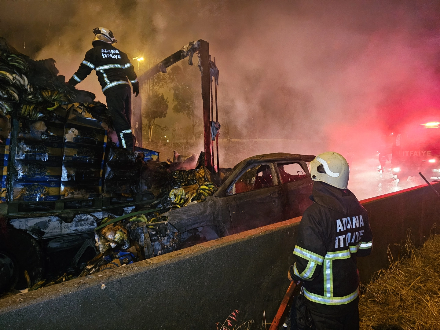 Gökhan KESKİNCİ/ ADANA, (DHA)- ADANA'da, otoyolda 3 aracın karıştığı zincirleme kazada TIR'a arkadan çarpıp, alev alan otomobildeki Mustafa E. ve yanındaki Hatice Ç.’yi çevredeki vatandaşlar kurtardı. Kaza, gece yarısı merkez Sarıçam ilçesi Tarsus- Adana- Gaziantep (TAG) Otoyolu Yıldırım Beyazıt Mahallesi yakınlarında meydana geldi. Mustafa E. yönetimindeki 01 VY 001 plakalı otomobil, iddiaya göre önce Abdulkadir C. yönetimindeki 06 CYY 572 plakalı cipe, ardından da Latif S.'nin kullandığı 27 R 4014 plakalı muz yüklü TIR'a çarptı. Zincirleme kazada TIR'ın dorsesinin altında sıkışan otomobil, yanmaya başladı. Kazadan yara almadan kurtulan diğer sürücüler ve çevredekiler, yanmaya başlayan otomobildeki Mustafa E. ve yanındaki Hatice Ç.'yi araçtan hafif yaralı olarak çıkardı. Alevler hızla otomobil ve muz yüklü dorseyi sararken, bölgeye itfaiye, sağlık ve jandarma ekipleri sevk edildi. Kazadan yaralı olarak kurtulan Mustafa E. ve Hatice Ç., sağlık ekiplerince hastaneye kaldırıldı. Otomobil ve TIR'ın dorsesini saran yangın, itfaiye ekiplerinin yarım saatlik müdahalesi sonucu söndürüldü. Yangında otomobil tamamen yanarak demir yığınına dönerken, TIR'ın dorsesi de kullanılmaz hale geldi.Jandarma, kazayla ilgili inceleme başlattı. (DHA)