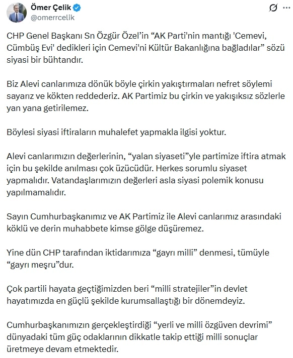 AK Parti Genel Başkan Yardımcısı ve Parti Sözcüsü Ömer Çelik, sosyal medya hesabından yaptığı açıklamada, "CHP Genel Başkanı Sayın Özgür Özel’in 'AK Parti'nin mantığı 'Cemevi, Cümbüş Evi' dedikleri için Cemevi'ni Kültür Bakanlığına bağladılar' sözü siyasi bir bühtandır. Biz Alevi canlarımıza dönük böyle çirkin yakıştırmaları nefret söylemi sayarız ve kökten reddederiz. AK Partimiz bu çirkin ve yakışıksız sözlerle yan yana getirilemez. Böylesi siyasi iftiraların muhalefet yapmakla ilgisi yoktur. Alevi canlarımızın değerlerinin, 'yalan siyaseti'yle partimize iftira atmak için bu şekilde anılması çok üzücüdür. Herkes sorumlu siyaset yapmalıdır. Vatandaşlarımızın değerleri asla siyasi polemik konusu yapılmamalıdır. Sayın Cumhurbaşkanımız ve AK Partimiz ile Alevi canlarımız arasındaki köklü ve derin muhabbete kimse gölge düşüremez" ifadelerini kullandı.