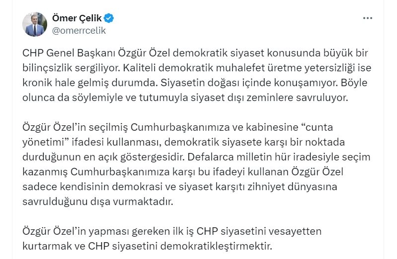 ANKARA, (DHA)- AK Parti Genel Başkanı Yardımcısı ve Parti Sözcüsü Ömer Çelik, "Özgür Özel'in seçilmiş Cumhurbaşkanımıza ve kabinesine 'cunta yönetimi' ifadesi kullanması, demokratik siyasete karşı bir noktada durduğunun en açık göstergesidir" dedi.AK Parti'li Çelik, sosyal medya hesabından yaptığı açıklamada, "CHP Genel Başkanı Özgür Özel demokratik siyaset konusunda büyük bir bilinçsizlik sergiliyor. Kaliteli demokratik muhalefet üretme yetersizliği ise kronik hale gelmiş durumda. Siyasetin doğası içinde konuşamıyor. Böyle olunca da söylemiyle ve tutumuyla siyaset dışı zeminlere savruluyor. Özgür Özel'in seçilmiş Cumhurbaşkanımıza ve kabinesine 'cunta yönetimi' ifadesi kullanması, demokratik siyasete karşı bir noktada durduğunun en açık göstergesidir. Defalarca milletin hür iradesiyle seçim kazanmış Cumhurbaşkanımıza karşı bu ifadeyi kullanan Özgür Özel, sadece kendisinin demokrasi ve siyaset karşıtı zihniyet dünyasına savrulduğunu dışa vurmaktadır. Özgür Özel'in yapması gereken ilk iş CHP siyasetini vesayetten kurtarmak ve CHP siyasetini demokratikleştirmektir" ifadelerini kullandı. (DHA)