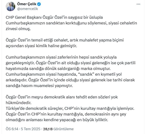ANKARA, (DHA)- AK Parti Genel Başkan Yardımcısı ve Parti Sözcüsü Ömer Çelik, "CHP Genel Başkanı Özgür Özel'in saygısız bir üslupla Cumhurbaşkanımızın sandıktan korktuğunu söylemesi, siyasi cehaletin zirvesi olmuş" dedi.AK Parti'li Ömer Çelik, sosyal medya hesabından yaptığı açıklamada, "CHP Genel Başkanı Özgür Özel'in saygısız bir üslupla Cumhurbaşkanımızın sandıktan korktuğunu söylemesi, siyasi cehaletin zirvesi olmuş. Özgür Özel'in temsil ettiği cehalet, artık muhalefet yapma biçimi açısından siyasi kimlik haline gelmiştir. Cumhurbaşkanımızın siyasi zaferlerinin hepsi sandık yoluyla gerçekleşmiştir. Özgür Özel'in ait olduğu siyasi geleneğin ise çok partili hayatımızda sandığa dönük saldırganlığı marka olmuştur. Cumhurbaşkanımızın siyasi hayatında, sandık en kıymetli yol arkadaşıdır. Özgür Özel'in içinde olduğu siyasi gelenek ise tarihi olarak sandığa hasım muamelesi yapmıştır. Özgür Özel'in meşru demokratik alanı tehdit eden sözleri yok hükmündedir. Türkiye'de demokratik süreçler, CHP'nin kurultay mantığıyla işlemiyor. Özgür Özel'in CHP'nin kurultay mantığıyla, demokrasinin aynı şey olmadığını anlaması kendine yapacağı en büyük iyiliktir" ifadelerini kullandı. (DHA)