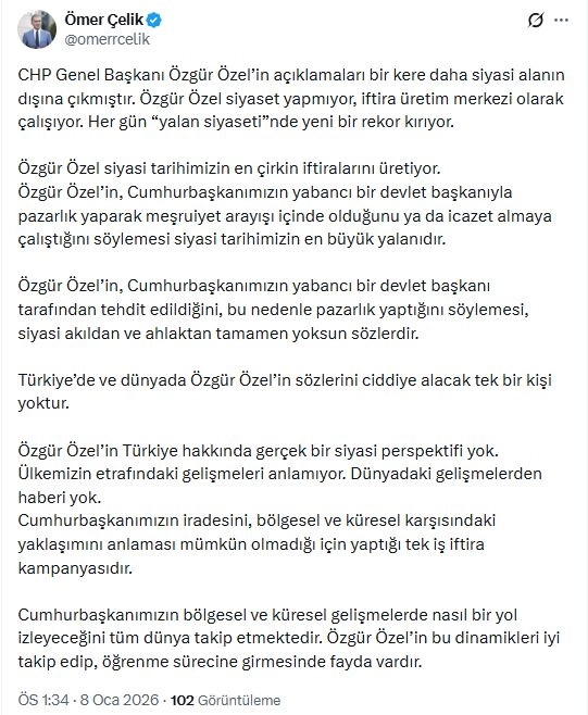 AK Parti'li Ömer Çelik, sanal medya hesabından yaptığı açıklamada, "CHP Genel Başkanı Özgür Özel'in açıklamaları bir kere daha siyasi alanın dışına çıkmıştır. Özgür Özel siyaset yapmıyor, iftira üretim merkezi olarak çalışıyor. Her gün yalan siyasetinde yeni bir rekor kırıyor. Özgür Özel, siyasi tarihimizin en çirkin iftiralarını üretiyor. Özgür Özel'in, Cumhurbaşkanımızın yabancı bir devlet başkanıyla pazarlık yaparak meşruiyet arayışı içinde olduğunu ya da icazet almaya çalıştığını söylemesi siyasi tarihimizin en büyük yalanıdır. Özgür Özel'in, Cumhurbaşkanımızın yabancı bir devlet başkanı tarafından tehdit edildiğini, bu nedenle pazarlık yaptığını söylemesi, siyasi akıldan ve ahlaktan tamamen yoksun sözlerdir" dedi.