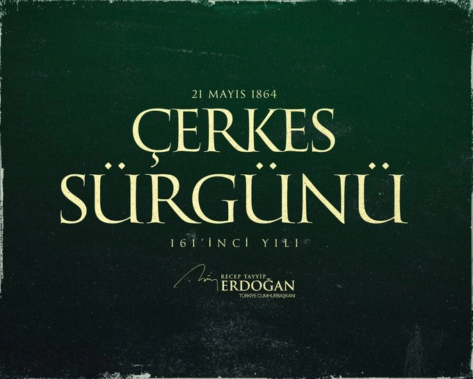 ANKARA, (DHA)- CUMHURBAŞKANI Recep Tayyip Erdoğan, Çerkes Sürgünü'nün 161'inci yıl dönümüne ilişkin paylaşımda bulundu.Cumhurbaşkanı Erdoğan, yaptığı paylaşımda, "Çerkes kardeşlerimizin Kafkasya’dan, ana vatanlarından haksızca, hukuksuzca, insanlık dışı yöntemlerle sürgün edilmelerinin yıl dönümünde hayatını kaybedenlere Allah’tan rahmet niyaz ediyor, yaşanan tarifsiz acıları yürekten paylaşıyorum" dedi. (DHA)
