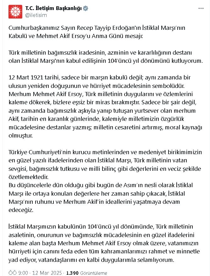 ANKARA, (DHA)- CUMHURBAŞKANI Recep Tayyip Erdoğan, İstiklal Marşı'nın kabulünün 104'üncü yıl dönümünü kutladı.İletişim Başkanlığı'nın sosyal medya hesabından, Cumhurbaşkanı Recep Tayyip Erdoğan'ın İstiklal Marşı'nın Kabulü ve Mehmet Akif Ersoy'u Anma Günü mesajı paylaşıldı. Cumhurbaşkanı Erdoğan, mesajında, "Türk milletinin bağımsızlık iradesinin, azminin ve kararlılığının destanı olan İstiklal Marşı'nın kabul edilişinin 104'üncü yıl dönümünü kutluyorum. 12 Mart 1921 tarihi, sadece bir marşın kabulü değil; aynı zamanda bir ulusun yeniden doğuşunun ve hürriyet mücadelesinin sembolüdür. Merhum Mehmet Akif Ersoy, Türk milletinin duygularını ve özlemlerini kaleme dökerek, bizlere eşsiz bir miras bırakmıştır. Sadece bir şair değil, aynı zamanda bağımsızlık aşkıyla yanıp tutuşan yurtsever olan merhum Akif, tarihin en karanlık günlerinde, kalemiyle milletimizin özgürlük mücadelesine destanlar yazmış; milletin cesaretini artırmış, moral kaynağı olmuştur. Türkiye Cumhuriyeti'nin kurucu metinlerinden ve medeniyet birikimimizin en güzel yazılı ifadelerinden olan İstiklal Marşı, Türk milletinin vatan sevgisi, bağımsızlık tutkusu ve milli bilinç gibi değerlerini en veciz şekilde özetlemektedir. Bu düşüncelerle dün olduğu gibi bugün de Asım'ın nesli olarak İstiklal Marşı ile ortaya konulan değerlere her zaman sahip çıkacak, İstiklal Marşı'nın ruhunu ve Merhum Akif'in ideallerini yaşatmaya devam edeceğiz. İstiklal Marşı'mızın kabulünün 104'üncü yıl dönümünde, Türk milletinin asaletinin, onurunun ve bağımsızlık mücadelesinin en güzel ifadelerini kaleme alan başta merhum Mehmet Akif Ersoy olmak üzere, vatanımızın hürriyeti için canını feda eden tüm kahramanlarımızı rahmet ve minnetle yad ediyor, vatandaşlarımı en kalbi duygularımla selamlıyorum" ifadelerini kullandı. (DHA)