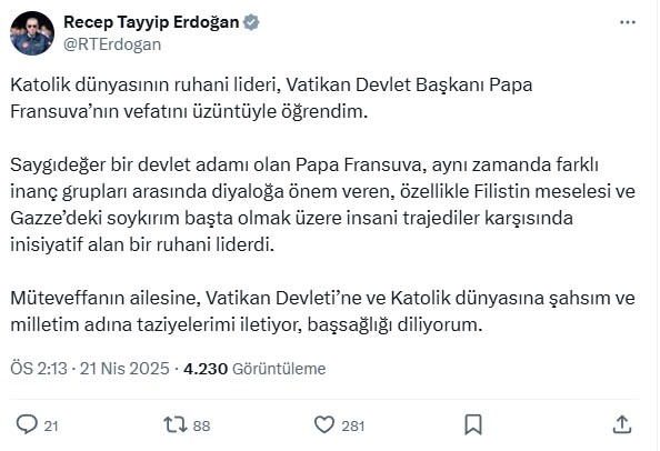 ANKARA, (DHA)- CUMHURBAŞKANI Recep Tayyip Erdoğan, Vatikan Devlet Başkanı Papa Fransuva’nın vefatı nedeniyle taziye mesajı yayımladı.Cumhurbaşkanı Recep Tayyip Erdoğan, "Katolik dünyasının ruhani lideri, Vatikan Devlet Başkanı Papa Fransuva’nın vefatını üzüntüyle öğrendim. Saygıdeğer bir devlet adamı olan Papa Fransuva, aynı zamanda farklı inanç grupları arasında diyaloğa önem veren, özellikle Filistin meselesi ve Gazze’deki soykırım başta olmak üzere insani trajediler karşısında inisiyatif alan bir ruhani liderdi. Müteveffanın ailesine, Vatikan Devleti’ne ve Katolik dünyasına şahsım ve milletim adına taziyelerimi iletiyor, başsağlığı diliyorum" ifadelerini kullandı. (DHA)