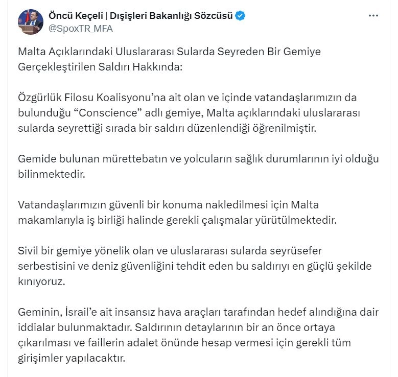 ANKARA, (DHA)- DIŞİŞLERİ Bakanlığı Sözcüsü Öncü Keçeli, Malta açıklarındaki uluslararası sularda seyreden bir gemiye gerçekleştirilen saldırıyla ilgili, "Vatandaşlarımızın da bulunduğu geminin, İsrail’e ait insansız hava araçları tarafından hedef alındığına dair iddialar bulunmaktadır. Vatandaşlarımızın güvenli bir konuma nakledilmesi için Malta makamlarıyla iş birliği halinde gerekli çalışmalar yürütülmektedir" dedi.Dışişleri Bakanlığı Sözcü Keçeli, sosyal medya hesabından yaptığı açıklamada, "Özgürlük Filosu Koalisyonu’na ait olan ve içinde vatandaşlarımızın da bulunduğu 'Conscience' adlı gemiye, Malta açıklarındaki uluslararası sularda seyrettiği sırada bir saldırı düzenlendiği öğrenilmiştir. Gemide bulunan mürettebatın ve yolcuların sağlık durumlarının iyi olduğu bilinmektedir. Vatandaşlarımızın güvenli bir konuma nakledilmesi için Malta makamlarıyla iş birliği halinde gerekli çalışmalar yürütülmektedir" dedi.Sözcü Keçeli, "Sivil bir gemiye yönelik olan ve uluslararası sularda seyrüsefer serbestisini ve deniz güvenliğini tehdit eden bu saldırıyı en güçlü şekilde kınıyoruz. Geminin, İsrail’e ait insansız hava araçları tarafından hedef alındığına dair iddialar bulunmaktadır. Saldırının detaylarının bir an önce ortaya çıkarılması ve faillerin adalet önünde hesap vermesi için gerekli tüm girişimler yapılacaktır" ifadelerini kullandı. (DHA)