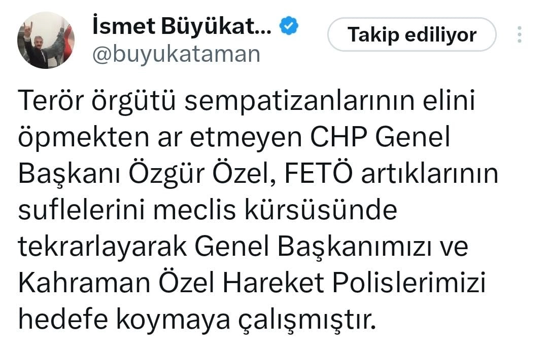 Umutcan ÖREN/ANKARA, (DHA)- MHP Genel Sekreteri İsmet Büyükataman, "Terör örgütü sempatizanlarının elini öpmekten ar etmeyen CHP Genel Başkanı Özgür Özel, FETÖ artıklarının suflelerini Meclis kürsüsünde tekrarlayarak Genel Başkanımızı ve kahraman özel hareket polislerimizi hedefe koymaya çalışmıştır" dedi.Özel Harekat Başkanı Süleyman Karadeniz, dünkü 15 Temmuz Demokrasi ve Milli Birlik Günü'nün anmaları kapsamında Özel Harekat Başkanlığı'nı ziyaret eden MHP Genel Başkanı Bahçeli'nin elini öptü. CHP Genel Başkanı Özgür Özel, partisinin bugünkü grup toplantısında Karadeniz'e, Bahçeli'nin elini öptüğü anda çekilen fotoğraf üzerinden tepki gösterdi. Özel, "Sen devletin polisi olmayı yanlış anlamışsın, yanlış devletin eline sarılmışsın" dedi.MHP Genel Sekreteri İsmet Büyükataman, Özgür Özel'in açıklamasına sosyal medya hesabından cevap verdi. Büyükataman, "Terör örgütü sempatizanlarının elini öpmekten ar etmeyen CHP Genel Başkanı Özgür Özel, FETÖ artıklarının suflelerini Meclis kürsüsünde tekrarlayarak Genel Başkanımızı ve kahraman özel hareket polislerimizi hedefe koymaya çalışmıştır. Türkiye Cumhuriyeti devletinin, 'Devlet seri katil' diyenlere sahip çıkanlardan, 'PKK sizi tükürüğü ile boğar' diyenlere kol kanat gerenlerden, 'Kimyasal silah kullandı' diyerek şanlı Türk askerine iftira atanlardan, terörün örgütünün siyasi uzantılarının gönlünü hoş etmek uğruna her türlü milli menfaatin karşısında pozisyon alanlardan öğrenecek bir devlet terbiyesi yoktur. Genel Başkanımız Sayın Devlet Bahçeli'nin Özel Harekat Başkanlığı'nı ziyaretinin ardından; FETÖ'cü ucubelerin, PKK'lı canilerin, fonlanan sözde gazetecilerin ve CHP'nin koro halinde saldırması elbette tesadüf değildir. Özel hareket polisleri, terörün ve uzantılarının korkulu rüyasıdır. Özgür Özel ve korosunun gerçek rahatsızlığı, terörle mücadeledeki kararlılığımız ve başarımızdır. Vatan evlatlarını, bu milletin göğsünü kabartan kahramanlarımızı hedefe koymak, terör örgütünün siyasi ofisiyle sinsice ittifak kuran CHP'ye yakışan bir tavırdır" ifadelerini kullandı. (DHA)