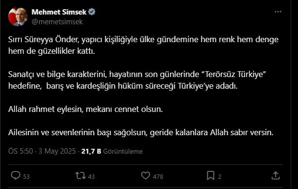 'RENKLİ KİŞİLİĞİ İLE HEM RENK HEM DENGE KATTI'Hazine ve Maliye Bakanı Mehmet Şimşek, Sırrı Süreyya Önder'in hayatını kaybetmesine ilişkin sosyal medya hesabından başsağlığı dileğinde bulunarak, "Sırrı Süreyya Önder, yapıcı kişiliğiyle ülke gündemine hem renk hem denge hem de güzellikler kattı. Sanatçı ve bilge karakterini, hayatının son günlerinde 'Terörsüz Türkiye' hedefine, barış ve kardeşliğin hüküm süreceği Türkiye'ye adadı. Allah rahmet eylesin, mekanı cennet olsun. Ailesinin ve sevenlerinin başı sağolsun, geride kalanlara Allah sabır versin" mesajını paylaştı.'SANA SÖZ, BU ÜLKEYE BARIŞ GELECEK'DEM Parti Eş Genel Başkanı Tuncer Bakırhan da sosyal medya hesabından paylaşım yaptı. Bakırhan, "Sevgili Sırrı Süreyya Önder'i kaybettik. Bu ülke, hakikati büyük bedellere rağmen dile getirmekten bir an bile imtina etmeyen büyük bir değerini yitirdi. Barışın dili, halkların kardeşliği için çarpan cesur bir yürek sustu. Sırrı, sadece bir siyasetçi değil; Türkiye'nin hafızası, onuru ve neşesiydi. Sözleriyle direnen, gülüşüyle umut olan bir insandı. Onu kaybetmenin acısı büyük. Ama biliyoruz ki Sırrı'nın düşleri bizimdir, yolu yolumuzdur. Hakkını helal et Sırrı. Uğurlar olsun, yoldaşım. Sana söz, bu ülkeye barış gelecek" dedi. (DHA)