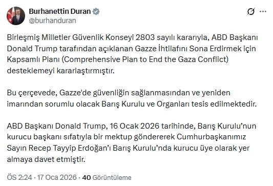 İletişim Başkanı Burhanettin Duran, sanal medya hesabından yaptığı açıklamada, "Birleşmiş Milletler Güvenlik Konseyi, 2803 sayılı kararıyla ABD Başkanı Donald Trump tarafından açıklanan 'Gazze İhtilafını Sona Erdirmek için Kapsamlı Planı' (Comprehensive Plan to End the Gaza Conflict), desteklemeyi kararlaştırmıştır. Bu çerçevede, Gazze'de güvenliğin sağlanmasından ve yeniden imarından sorumlu olacak Barış Kurulu ve organları tesis edilmektedir. ABD Başkanı Donald Trump, 16 Ocak 2026 tarihinde, Barış Kurulu'nun kurucu başkanı sıfatıyla bir mektup göndererek Cumhurbaşkanımız Sayın Recep Tayyip Erdoğan'ı Barış Kurulu'nda kurucu üye olarak yer almaya davet etmiştir" dedi. (DHA)