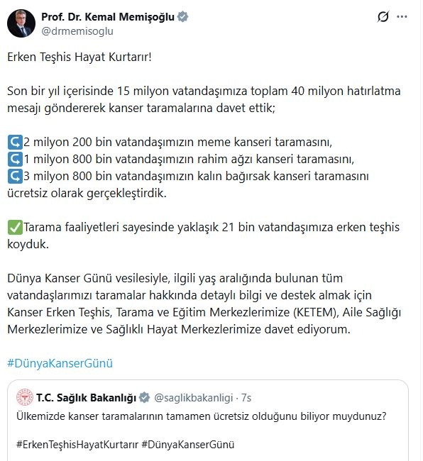 Bakan Kemal Memişoğlu, sanal medya hesabından 'Erken teşhis hayat kurtarır' notuyla yaptığı paylaşımda, "Son 1 yıl içerisinde 15 milyon vatandaşımıza toplam 40 milyon hatırlatma mesajı göndererek kanser taramalarına davet ettik; 2 milyon 200 bin vatandaşımızın meme kanseri taramasını, 1 milyon 800 bin vatandaşımızın rahim ağzı kanseri taramasını, 3 milyon 800 bin vatandaşımızın kalın bağırsak kanseri taramasını ücretsiz olarak gerçekleştirdik. Tarama faaliyetleri sayesinde yaklaşık 21 bin vatandaşımıza erken teşhis koyduk. Dünya Kanser Günü vesilesiyle, ilgili yaş aralığında bulunan tüm vatandaşlarımızı taramalar hakkında detaylı bilgi ve destek almak için Kanser Erken Teşhis, Tarama ve Eğitim Merkezlerimize (KETEM), Aile Sağlığı Merkezlerimize ve Sağlıklı Hayat Merkezlerimize davet ediyorum" dedi. (DHA)