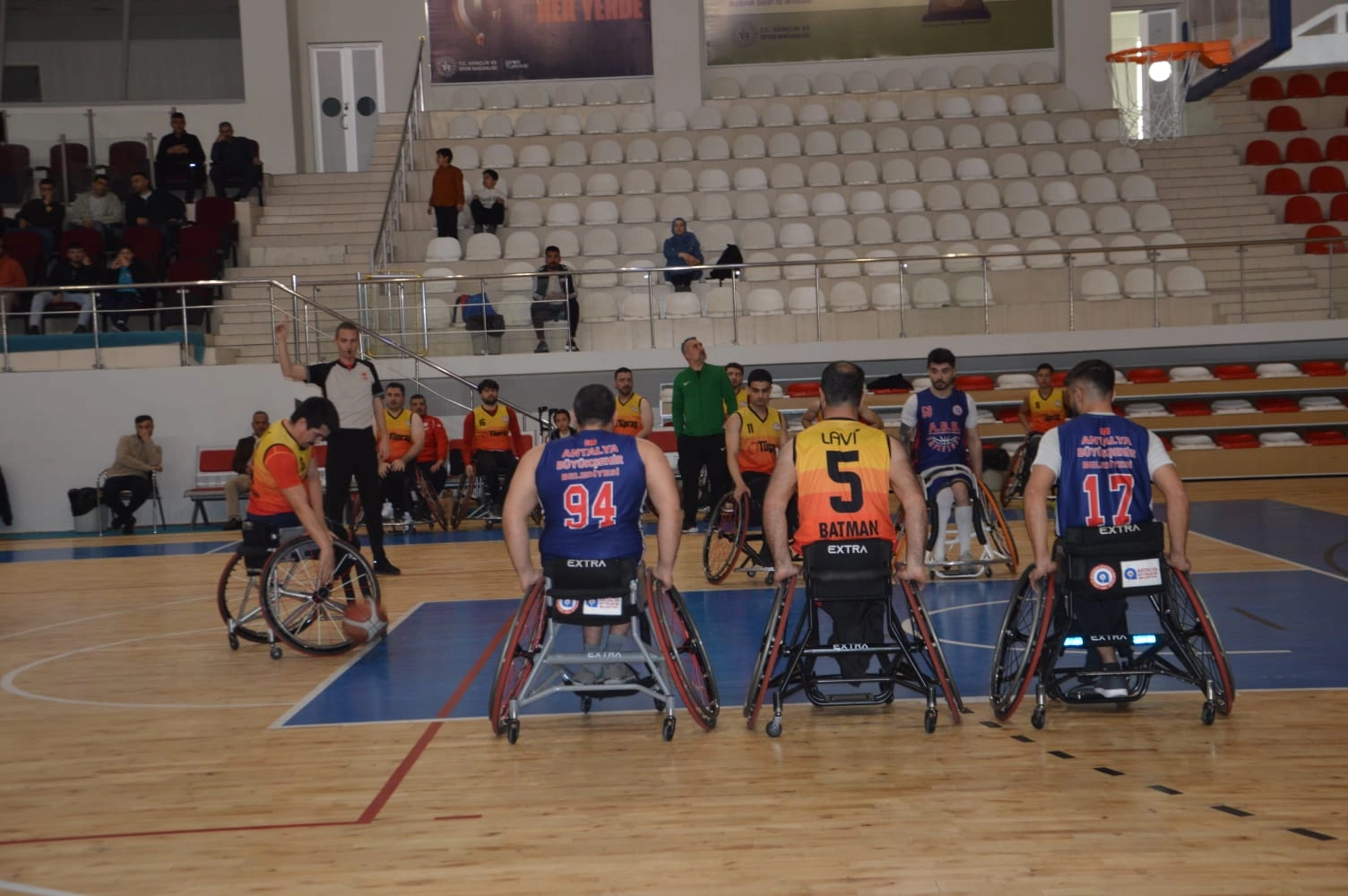 Bayram AYHAN/BATMAN, (DHA)- TÜRKİYE Basketbol Federasyonu Tekerlekli Sandalye Basketbol 1'inci Ligi B grubunda mücadele eden Batman Engelliler Spor Kulübü, Play-Off çeyrek final ikinci maçında konuk ettiği Antalya Büyükşehir Belediyesi Spor Kulübüne 48-66 mağlup oldu. Batman Engelliler Spor Kulübü, 19 Mayıs Kapalı Spor Salonu'nda Antalya Büyükşehir Belediyesi Spor Kulübünü konuk etti. Karşılaşmaya Batman ekibi, Şakir Velioğlu, Serhat Kaya, Nuri Rokon, Hasan Alkun ve Ümit Koca beşlisiyle çıktı. İlk periyod rakibine karşı zorlanan Batman ekibi maçı 10-17 geride tamamladı. İkinci çeyrekte baskısını arttıran Batman ekibi skoru 31-33 geride tamamladı. Maçın son iki çeyreğinde de istediği sonucu alamayan Batman Ekibi 48-66 mağlup oldu.(DHA)