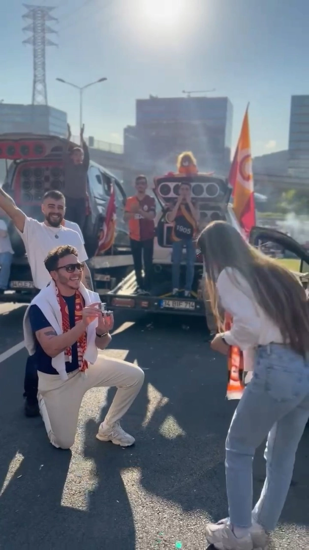 Ali Sencer ARSLAN/ZONGULDAK,(DHA)- ZONGULDAK’tan Galatasaray’ın şampiyonluğunu kutlamak için İstanbul’a giden Özgür Kahveci ve Fulya Yılmaz, şampiyonluğu evlilik teklifi ile taçlandırdı. Rams Park çevresinde Kahveci, sevgilisi Yılmaz’a şarkılar eşliğinde evlilik teklif ederken 'Evet' cevabını aldı. Galatasaray’ın dün akşam 25’inci şampiyonluğunu ilan etmesinin ardından yapılan kutlamalar için bugün Zonguldak’tan bazı taraftarlar İstanbul’a gitti. Kutlamalara giden Özgür Kahveci ve Fulya Yılmaz çifti, şampiyonluk kutlamalarını evlilik teklifi ile taçlandırdı. Rams Park’ta Kahveci, sevgilisi Fulya Yılmaz’a şarkılar eşliğinde evlilik teklifi etti. Yılmaz’ın ‘evet’ cevabıyla çift, birbirine sarılarak sevinç yaşadı. O anları, kutlamalarda bulunan bir başka taraftar cep telefonu kamerası ile görüntüledi. (DHA)