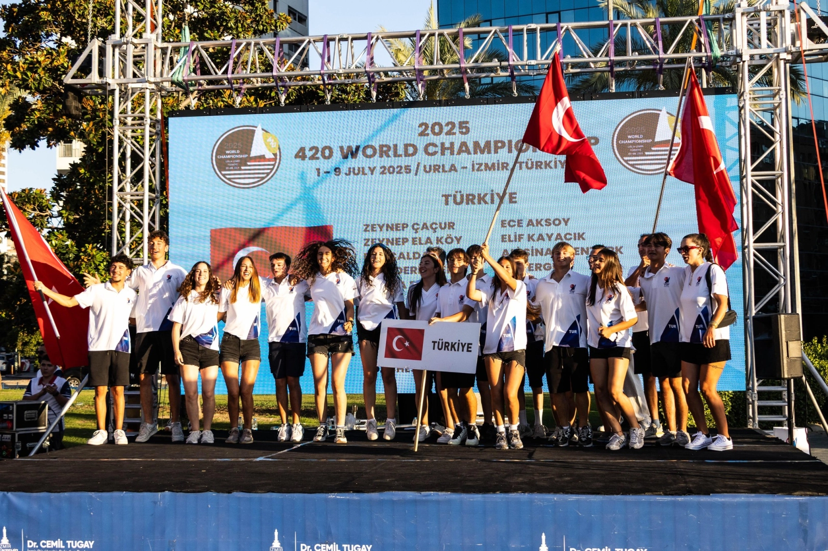 İZMİR, (DHA)- TÜRKİYE Yelken Federasyonu’nun (TYF) ev sahipliği yaptığı ve 20 ülkeden 434 sporcunun katılım gösterdiği 420 Dünya Şampiyonası’nın resmi açılışı İzmir Cumhuriyet Meydanı’nda düzenlenen törenle gerçekleştirildi. Urla’da bulunan ve 1957'de kurulan Yelken Federasyonu'nun ilk uluslararası tesisi olan TYF Olimpik Kamp Merkezi'nde düzenlenen organizasyonun açılışı için sporcular, teknik kadrolar, ulusal ve uluslararası yarış yönetimi ve Uluslararası Sınıf Birliği yöneticilerinden oluşan 580 yelken sevdalısı, vapur ile İzmir’i denizden seyrederek tören alanına ulaştı. Bando ve dalgalanan ülke bayrakları eşliğinde gerçekleştirilen yürüyüş sonrasında tören, Atatürk Anıtı’na çelenk sunulmasıyla başladı. TYF Başkanı Özlem Akdurak, Uluslararası 420 Sınıf Birliği Başkanı Jackie Taylor, İzmir Büyükşehir Belediyesi Meclis Üyesi Nurcan Adıgüzel ve İzmir Gençlik ve Spor İl Müdürü Murat Eskici’nin konuşmalarından sonra Türkiye Halk Dansları Federasyonu İzmir Folklor Ekibinin Zeybek Dansı gösterisi ilgi ile izlendi. Ülkelerinin popüler müzikleri eşliğinde tek tek sahneye davet edilen ülke takımlarının coşkusuna çok sayıdaki davetli ve gönüllüler eşlik etti. Şampiyona 420 sınıf bayrağının göndere çekilmesiyle resmi olarak start aldı. 20 ülkeden 434 sporcunun katılımıyla gerçekleşecek şampiyona 8 gün boyunca dünyanın dört bir yanından gelen yelkencilerin kıyasıya mücadelesine sahne olacak.