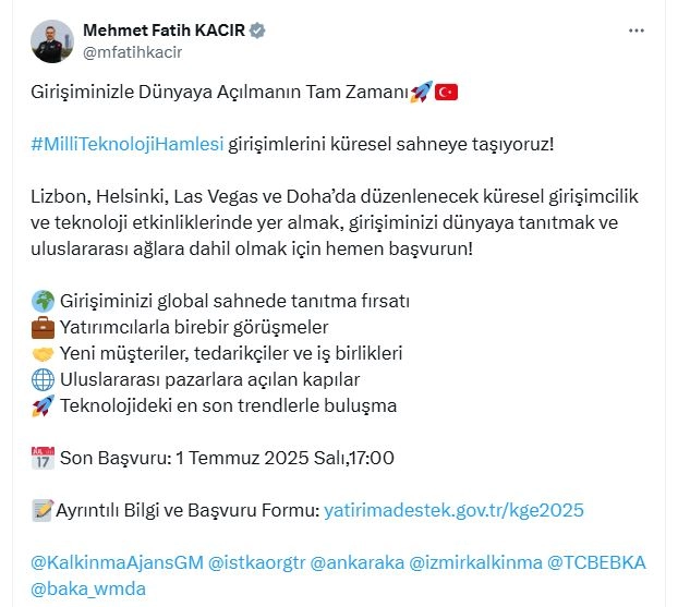 ANKARA, (DHA)- SANAYİ ve Teknoloji Bakanı Mehmet Fatih Kacır, Lizbon, Helsinki, Las Vegas ve Doha'da düzenlenecek küresel girişimcilik ve teknoloji etkinliklerine katılım çağrısında bulundu. Sanayi ve Teknoloji Bakanı Mehmet Fatih Kacır, sosyal medya hesabından yaptığı açıklamada, "Girişiminizle dünyaya açılmanın tam zamanı. Milli Teknoloji Hamlesi girişimlerini küresel sahneye taşıyoruz. Lizbon, Helsinki, Las Vegas ve Doha'da düzenlenecek küresel girişimcilik ve teknoloji etkinliklerinde yer almak, girişiminizi dünyaya tanıtmak ve uluslararası ağlara dahil olmak için hemen başvurun" ifadelerini kullandı.Kacır'ın paylaşımında yer verilen bilgilere göre; başvuruculara, yatırımcılarla birebir görüşme yapma, yeni müşteri kazanma, tedarikçilerle tanışma, yeni iş birlikleri kurma ve teknolojideki en son trendlerle buluşma fırsatı sunulacak. Çağrıya başvurular, 1 Temmuz Salı günü saat 17.00'ye kadar yapılabilecek. Ayrıntılı bilgi ve başvuru formuna, 'yatirimadestek.gov.tr/kge2025' adresinden ulaşılabilecek. (DHA)