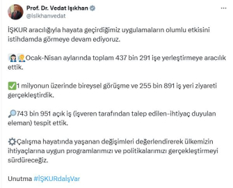 ANKARA, (DHA)- ÇALIŞMA ve Sosyal Güvenlik Bakanı Vedat Işıkhan, Türkiye İş Kurumu (İŞKUR) aracılığı ile ocak-nisan aylarında 437 bin 291 işe yerleştirmeye aracılık ettiklerini açıkladı.Çalışma ve Sosyal Güvenlik Bakanı Vedat Işıkhan, sosyal medya hesabından yaptığı açıklamada, "İŞKUR aracılığıyla hayata geçirdiğimiz uygulamaların olumlu etkisini istihdamda görmeye devam ediyoruz. Ocak-nisan aylarında toplam 437 bin 291 işe yerleştirmeye aracılık ettik. 1 milyonun üzerinde bireysel görüşme ve 255 bin 891 iş yeri ziyareti gerçekleştirdik. 743 bin 951 açık iş (işveren tarafından talep edilen-ihtiyaç duyulan eleman) tespit ettik. Çalışma hayatında yaşanan değişimleri değerlendirerek ülkemizin ihtiyaçlarına uygun programlarımızı ve politikalarımızı gerçekleştirmeyi sürdüreceğiz" ifadelerini kullandı. (DHA)