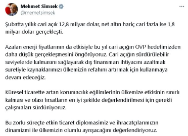 ANKARA, (DHA)- HAZİNE ve Maliye Bakanı Mehmet Şimşek, "Azalan enerji fiyatlarının da etkisiyle bu yıl cari açığın OVP (Orta Vadeli Program) hedefimizden daha düşük gerçekleşmesini öngörüyoruz" dedi.Hazine ve Maliye Bakanı Mehmet Şimşek, cari denge verilerine ilişkin sosyal medya hesabından yaptığı açıklamada, "Şubatta yıllık cari açık 12,8 milyar dolar, net altın hariç cari fazla ise 1,8 milyar dolar gerçekleşti. Azalan enerji fiyatlarının da etkisiyle bu yıl cari açığın OVP hedefimizden daha düşük gerçekleşmesini öngörüyoruz. Cari açığın sürdürülebilir seviyelerde kalmasını sağlayarak dış finansman ihtiyacını azaltmak suretiyle kaynaklarımızı ülkemizin refahını artırmak için kullanmaya devam edeceğiz. Küresel ticarette artan korumacılık eğilimlerinin ülkemize etkisinin sınırlı kalması ve olası fırsatların en iyi şekilde değerlendirilmesi için gerekli çalışmaları sürdürüyoruz. Bu zorlu süreçte etkin ticaret diplomasimiz ve ihracatçılarımızın dinamizmi ile ülkemizin olumlu ayrışacağını değerlendiriyoruz" ifadelerini kullandı. (DHA)