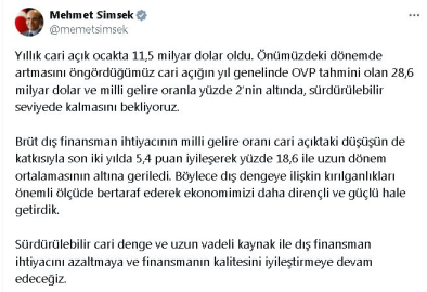 ANKARA, (DHA)- HAZİNE ve Maliye Bakanı Mehmet Şimşek, "Yıllık cari açık ocakta 11,5 milyar dolar oldu. Önümüzdeki dönemde artmasını öngördüğümüz cari açığın yıl genelinde OVP (Orta Vadeli Program) tahmini olan 28,6 milyar dolar ve milli gelire oranla yüzde 2'nin altında, sürdürülebilir seviyede kalmasını bekliyoruz" dedi.Hazine ve Maliye Bakanı Mehmet Şimşek, ocak ayı ödemeler dengesi istatistiklerine ilişkin sosyal medya hesabından yaptığı açıklamada, "Yıllık cari açık ocakta 11,5 milyar dolar oldu. Önümüzdeki dönemde artmasını öngördüğümüz cari açığın yıl genelinde OVP tahmini olan 28,6 milyar dolar ve milli gelire oranla yüzde 2'nin altında, sürdürülebilir seviyede kalmasını bekliyoruz. Brüt dış finansman ihtiyacının milli gelire oranı, cari açıktaki düşüşün de katkısıyla son 2 yılda 5,4 puan iyileşerek yüzde 18,6 ile uzun dönem ortalamasının altına geriledi. Böylece dış dengeye ilişkin kırılganlıkları önemli ölçüde bertaraf ederek ekonomimizi daha dirençli ve güçlü hale getirdik. Sürdürülebilir cari denge ve uzun vadeli kaynak ile dış finansman ihtiyacını azaltmaya ve finansmanın kalitesini iyileştirmeye devam edeceğiz" ifadelerini kullandı. (DHA)